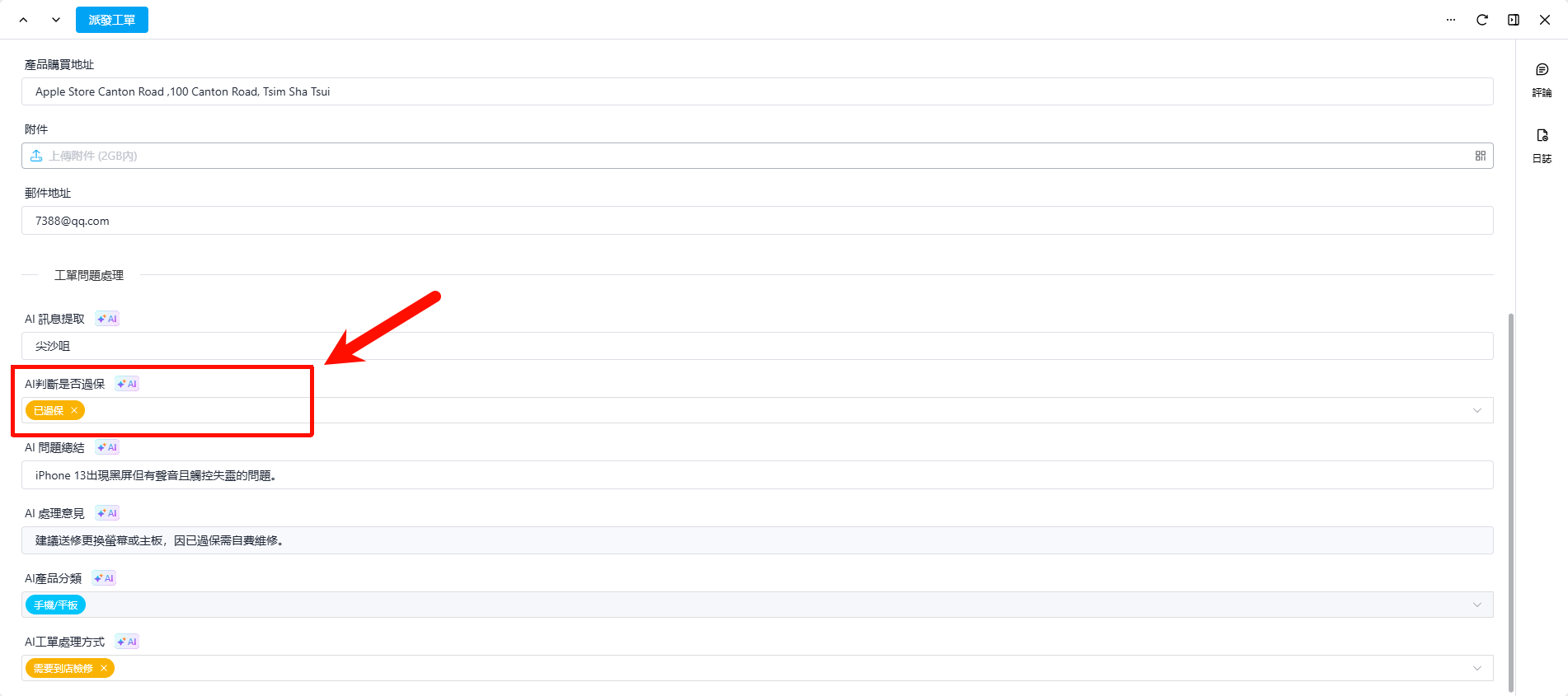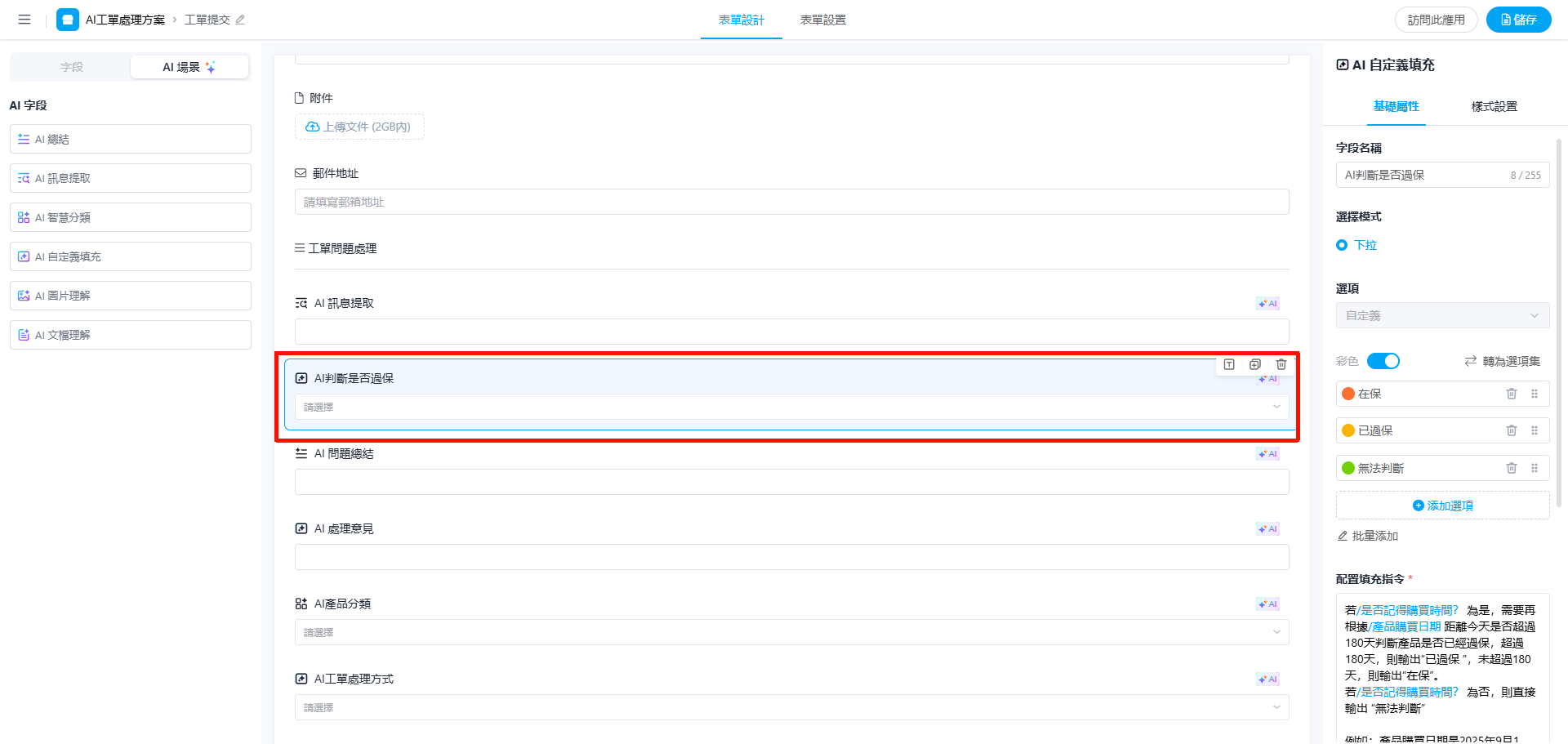 如效果圖所示,在「AI 判斷是否過保」欄位中,系統根據配置的指令邏輯,讀取了相關欄位的值(購買時間記錄及購買日期),經過計算判斷後,自動輸出了「已過保」的結果。整個過程無需人工核對日期,大幅降低了人為失誤的風險。