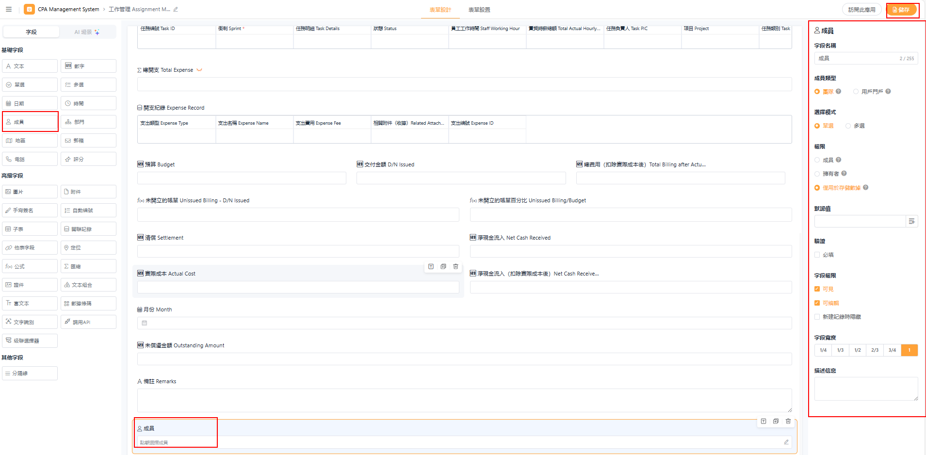 重要说明:此处的权限设置必须与“应用权限组”配合生效。如果成员所在的权限组未获得相应的工作表访问权限,即使在此字段被设置为“拥有者”,也可能无法操作记录。