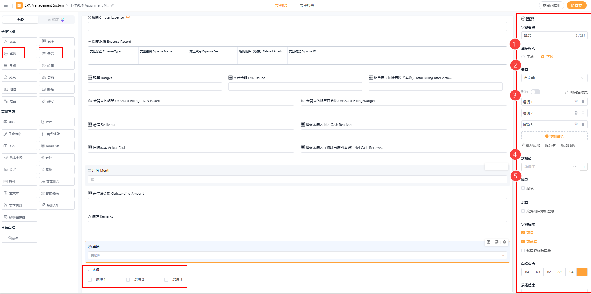 选项字段允许您预设一组选项,供用户在录入数据时直接选择。分为单选(仅能选一项)和多选(可同时选择多项)两种模式。