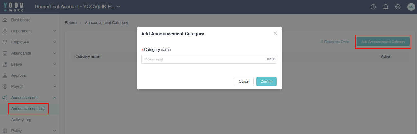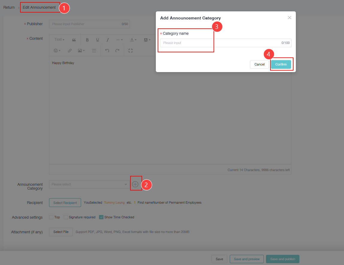 2.2 You can also directly add an announcement category when creating a new announcement by filling in the category name and clicking confirm.