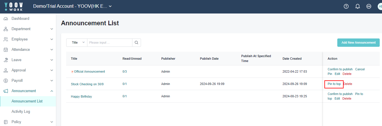 * **APP Version**: Employees can view announcement notifications within the app. When an employee clicks "I have read," it indicates acknowledgment.