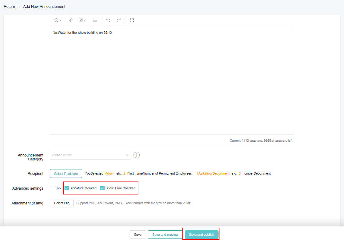 * In the newly added announcement page, you can set whether to pin it to the top, display viewing time, recipients, etc. After the settings are completed, just click \[Save And Preview].&#x20;