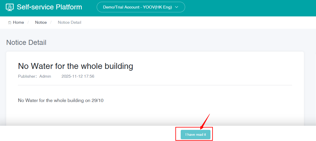 * **PC Version**: Employees can view announcement notifications on the self-service platform. When an employee clicks "I have read," it indicates acknowledgment.