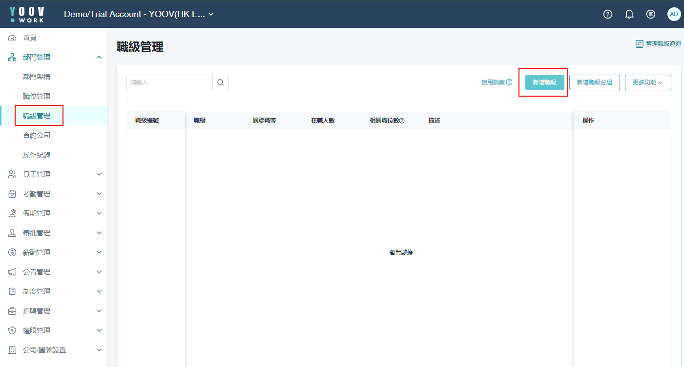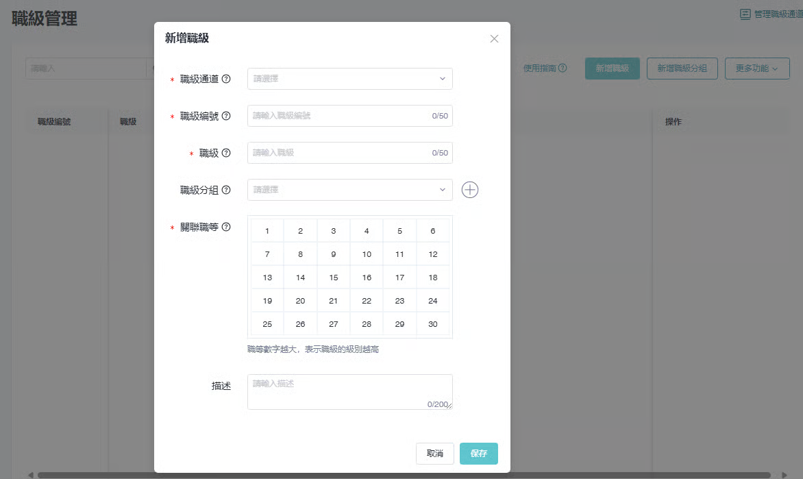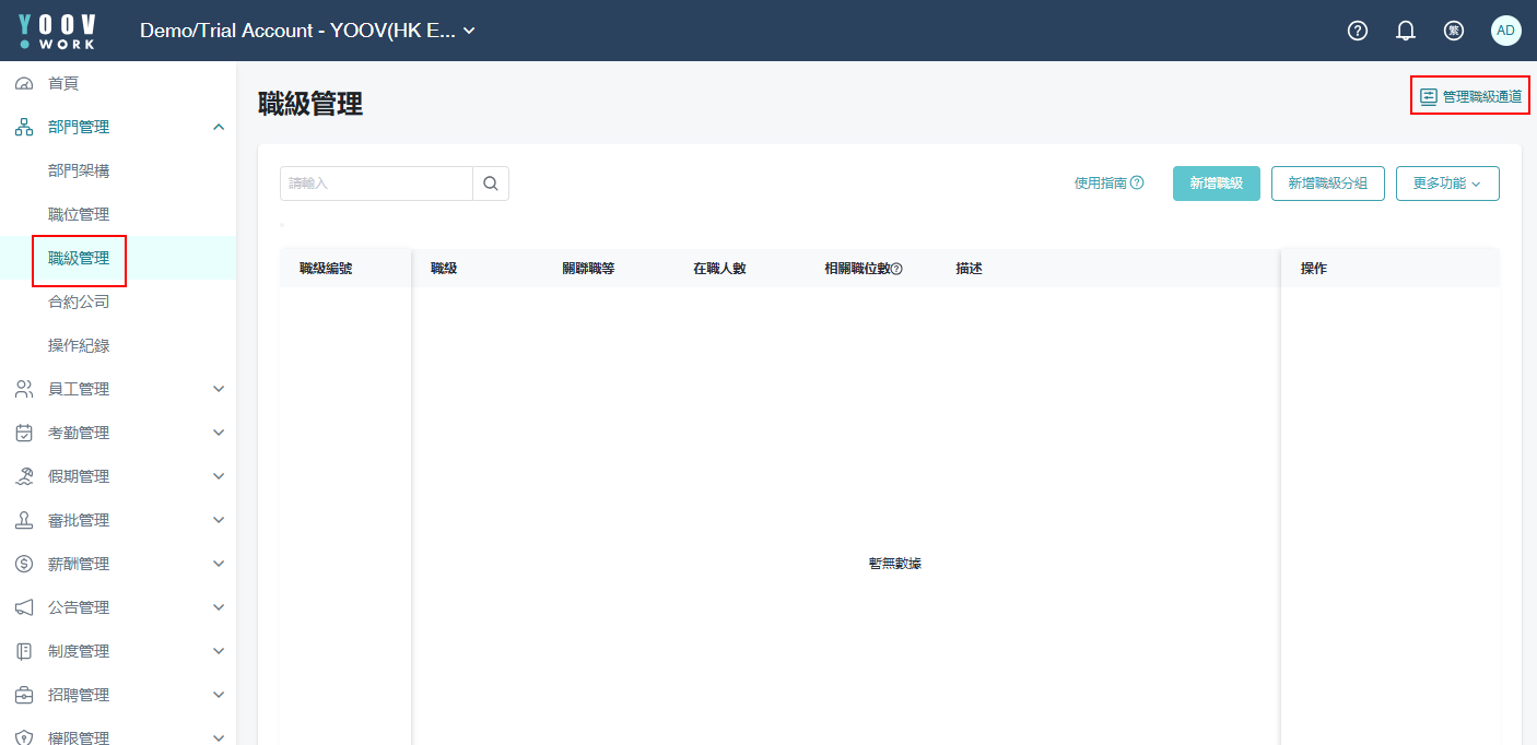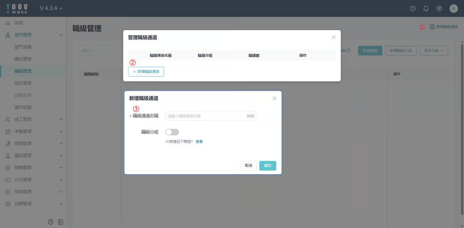 操作步骤: ① [部门管理] > [职级管理] > [管理职级通道] > [新增职级通道] > 填写职级通道名称 > 按 「确定」 ② [部门管理] > [职级管理] > [新增职级] > 填写职级信息 > 按 「保存」