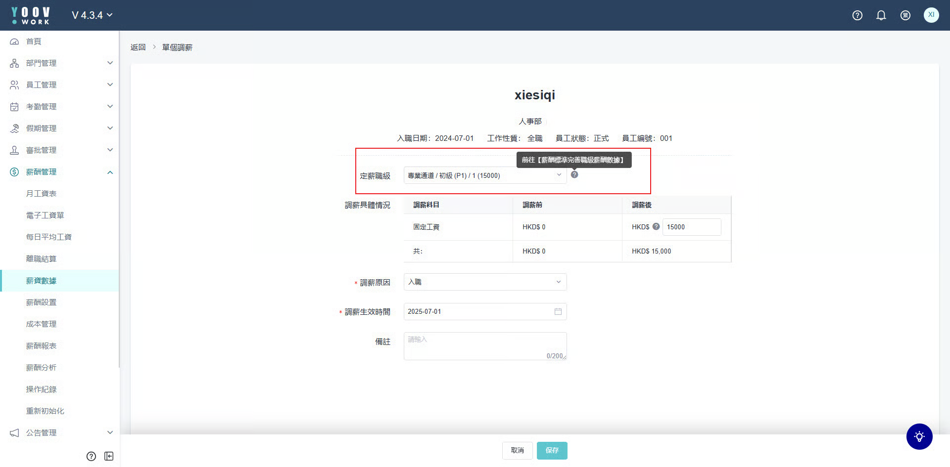 操作步骤: ① [当前工资] > [办理调薪] > [单个调薪] ② 进入调薪页面,为员工选择 「定薪职级」 ,也可以修改调薪后薪资 ,填写相关信息后点 「保存」。 ③ 此时,已经把员工的薪资确定,之后就是加入薪资组,按薪资模板进行薪资计算即可。 ④ 在计算薪资时,如果同月内,有员工的职级或档位调整,薪资也可以自动按规则正确计算。