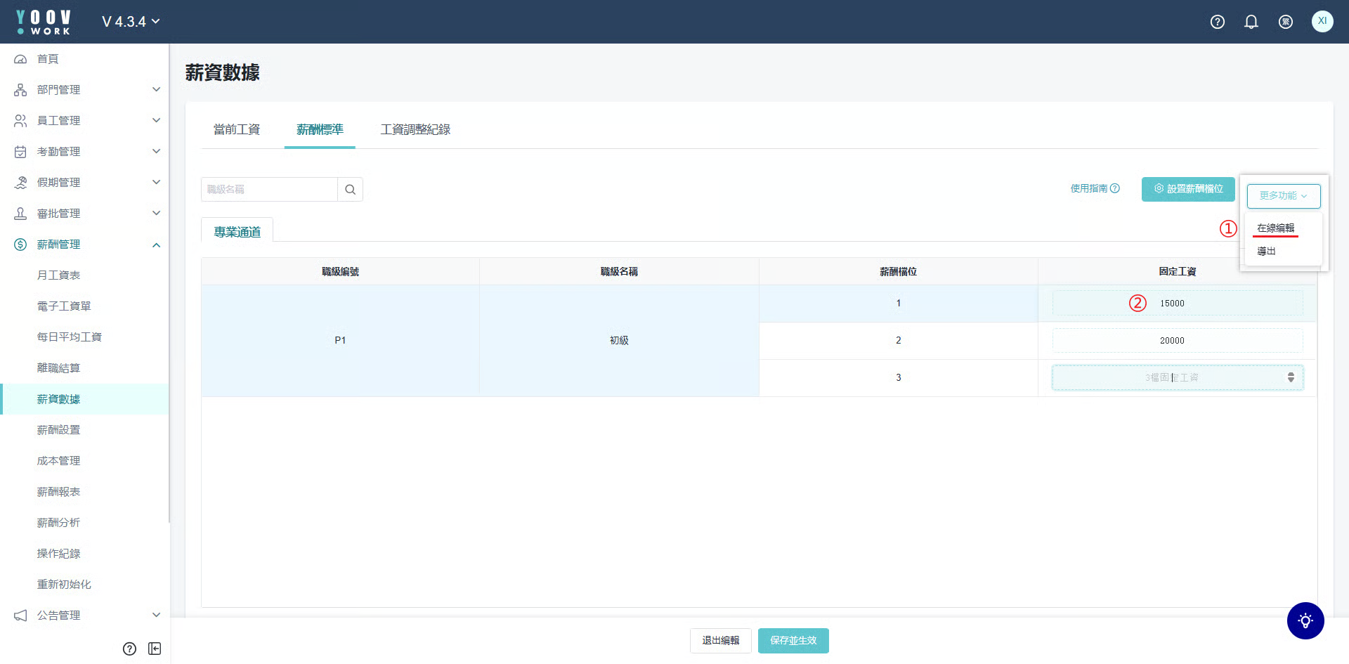 操作步骤: ① 回到 「薪酬数据」 页面,会直接同步刚刚建立的职级体系,并且薪酬档位默认出现三档。 ② 如果需要更多档位,可以点击 「设置薪酬档位」,修改薪酬 「档位数量」,同时也可以修改 「薪酬档位名称」,最后点击 「确定」 。 ③ 确定好薪酬档位后,可以编辑各职级对应的薪酬档位的固定工资。 ④ 操作步骤:[更多功能] > [在线编辑] > [修改固定工资] > [保存并生效]