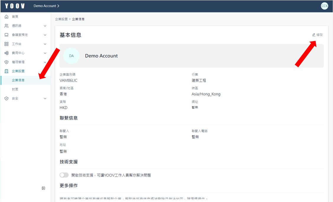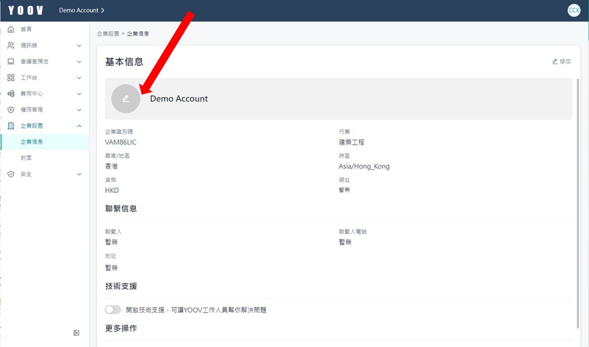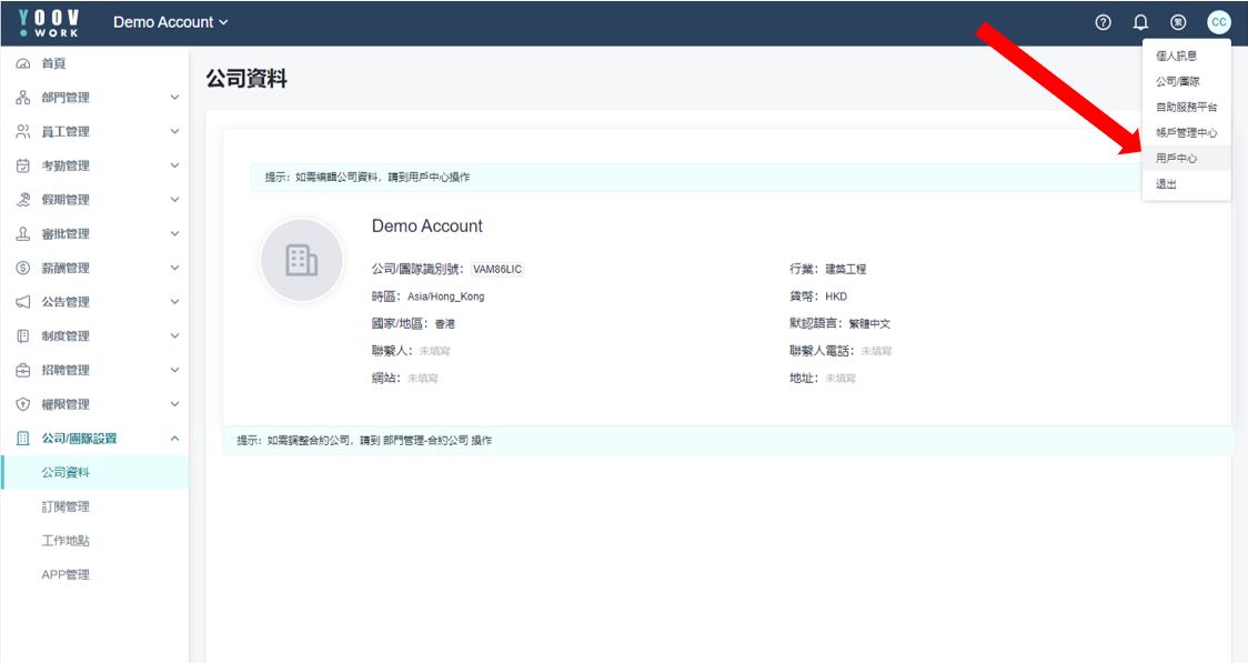 1.［用户中心］>［企业设置］>［企业信息］中可以修改/新增公司的基本讯息。 \