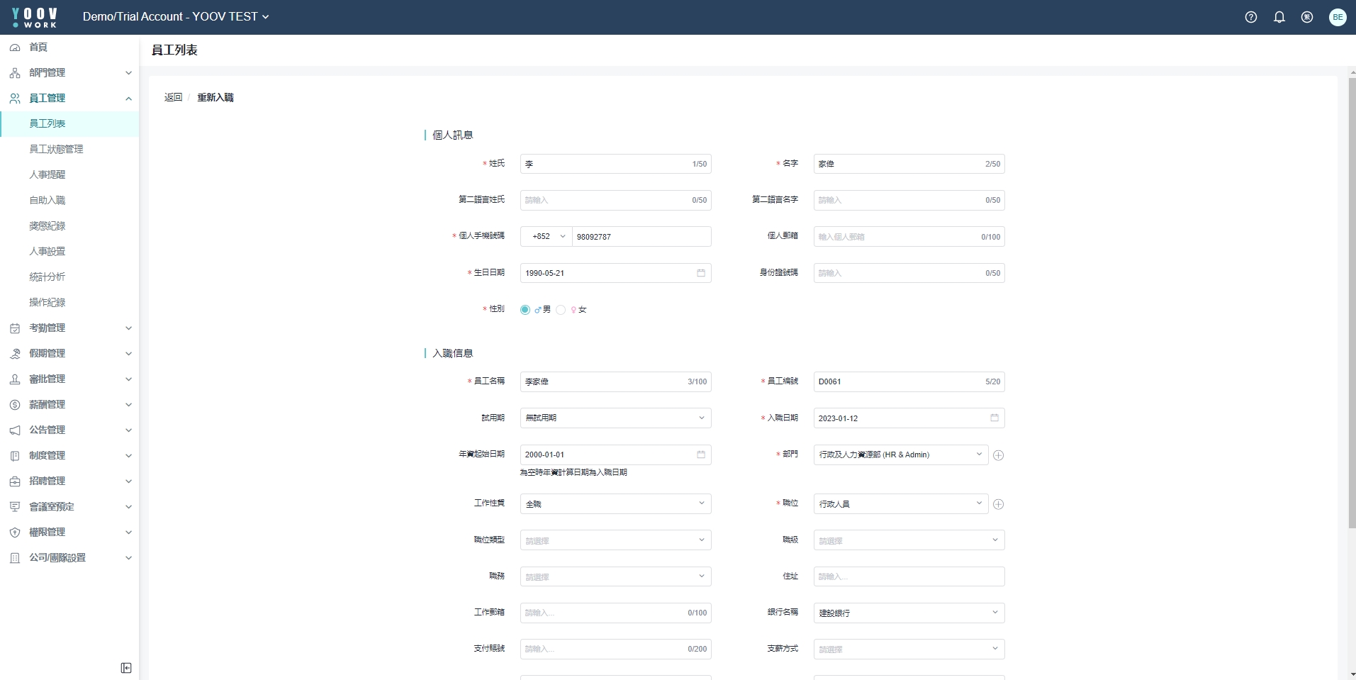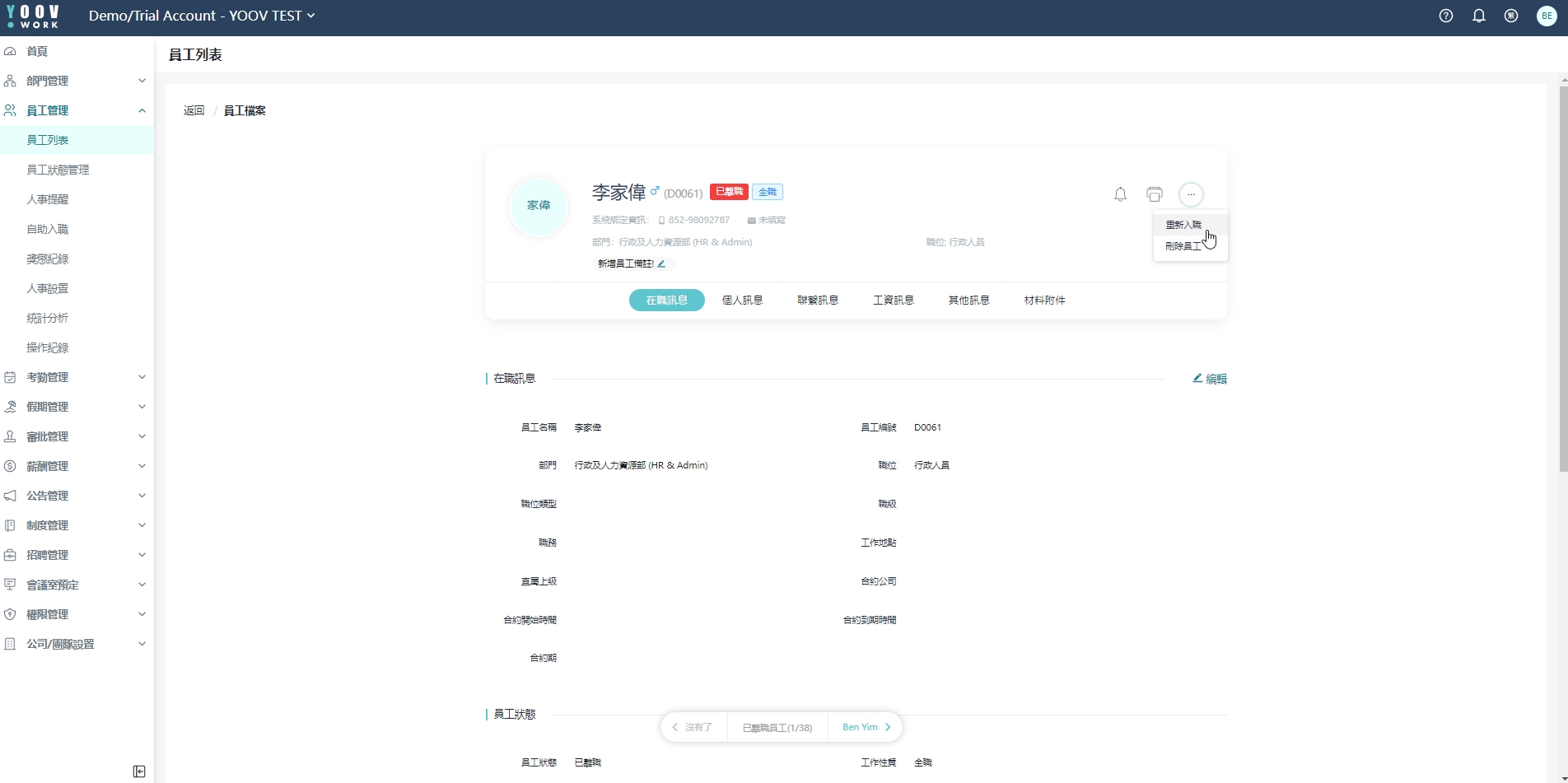 如果管理员不小心错误地把员工离职或因公司需要有必要安排员工重新入职, 可参考以下的处理方式: