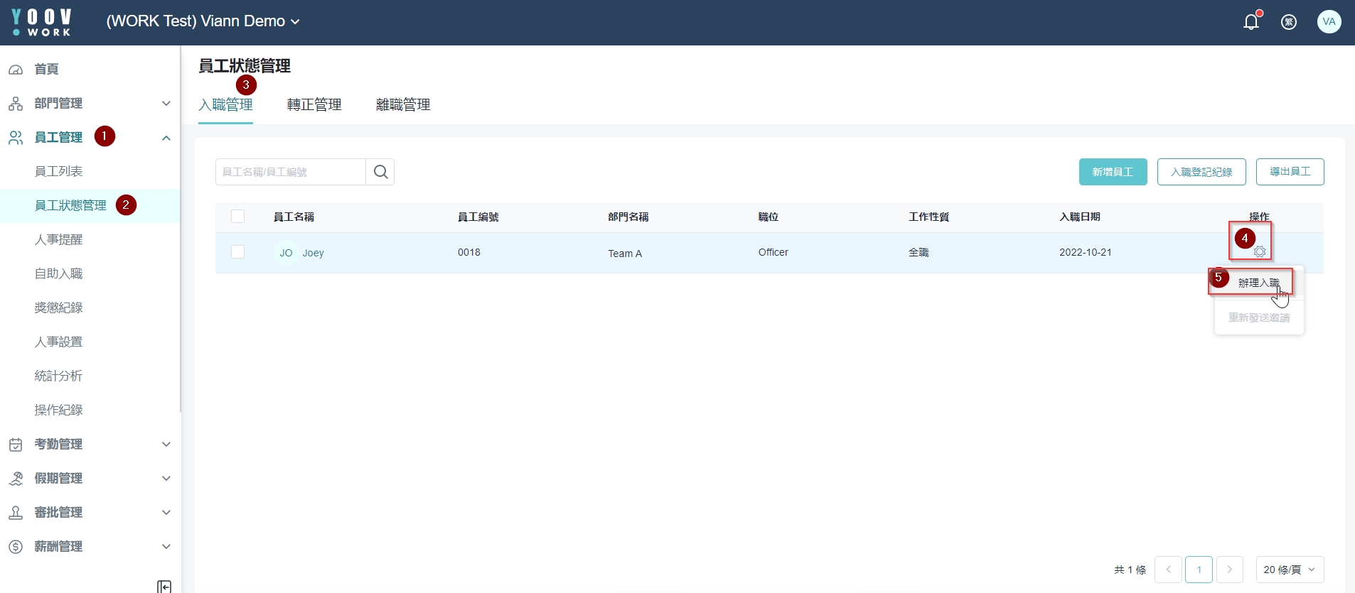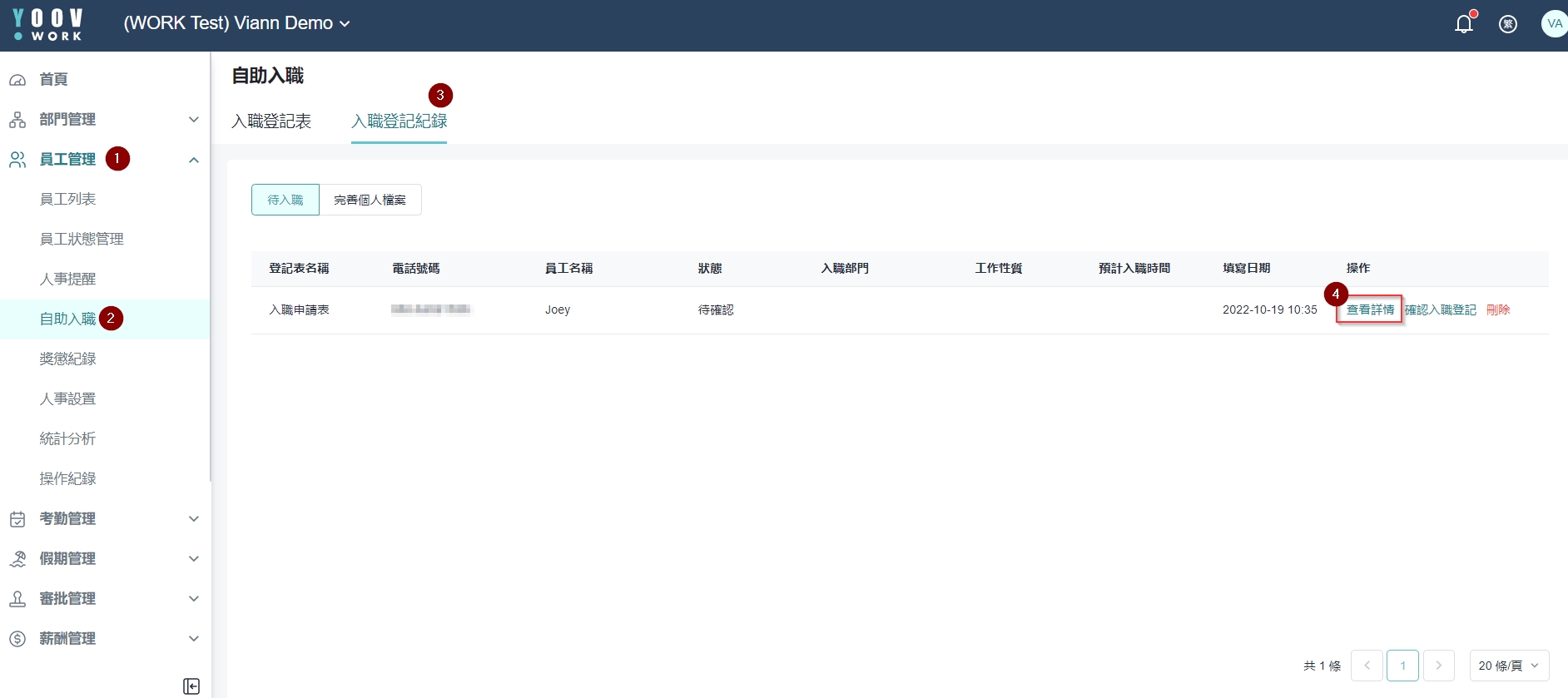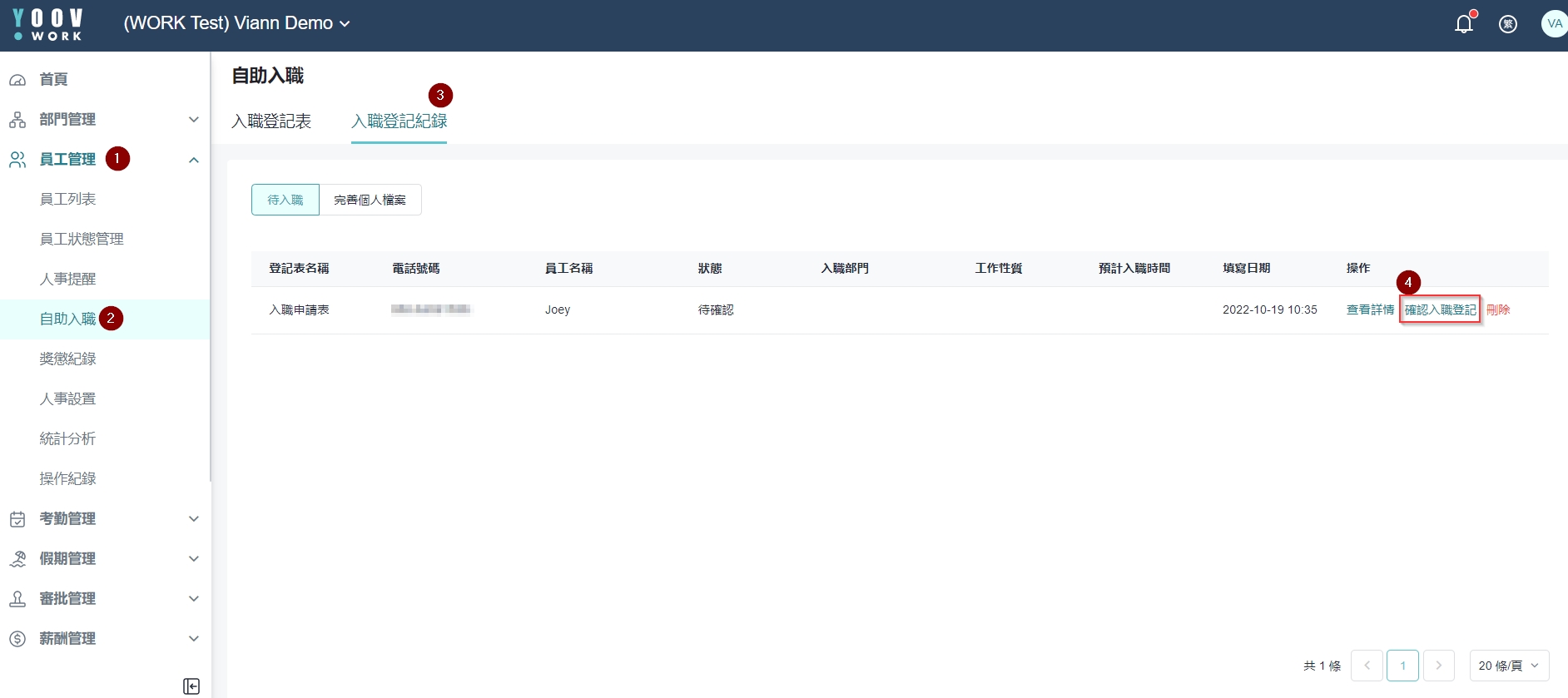 在Joey首天上班当日,才按「确认入职登记」。