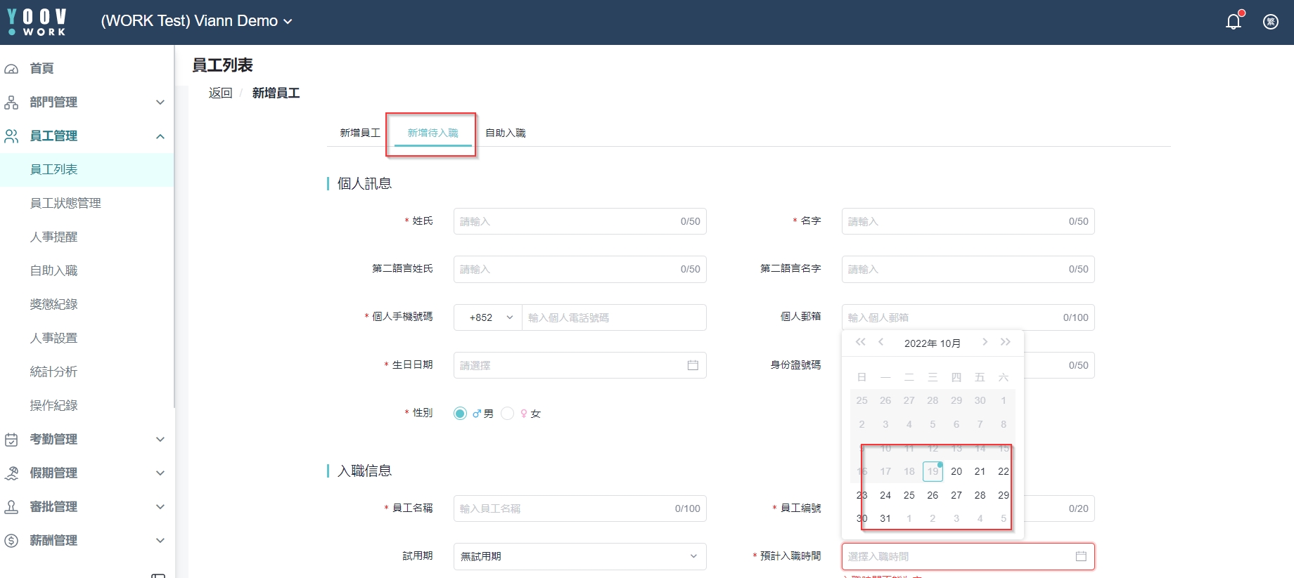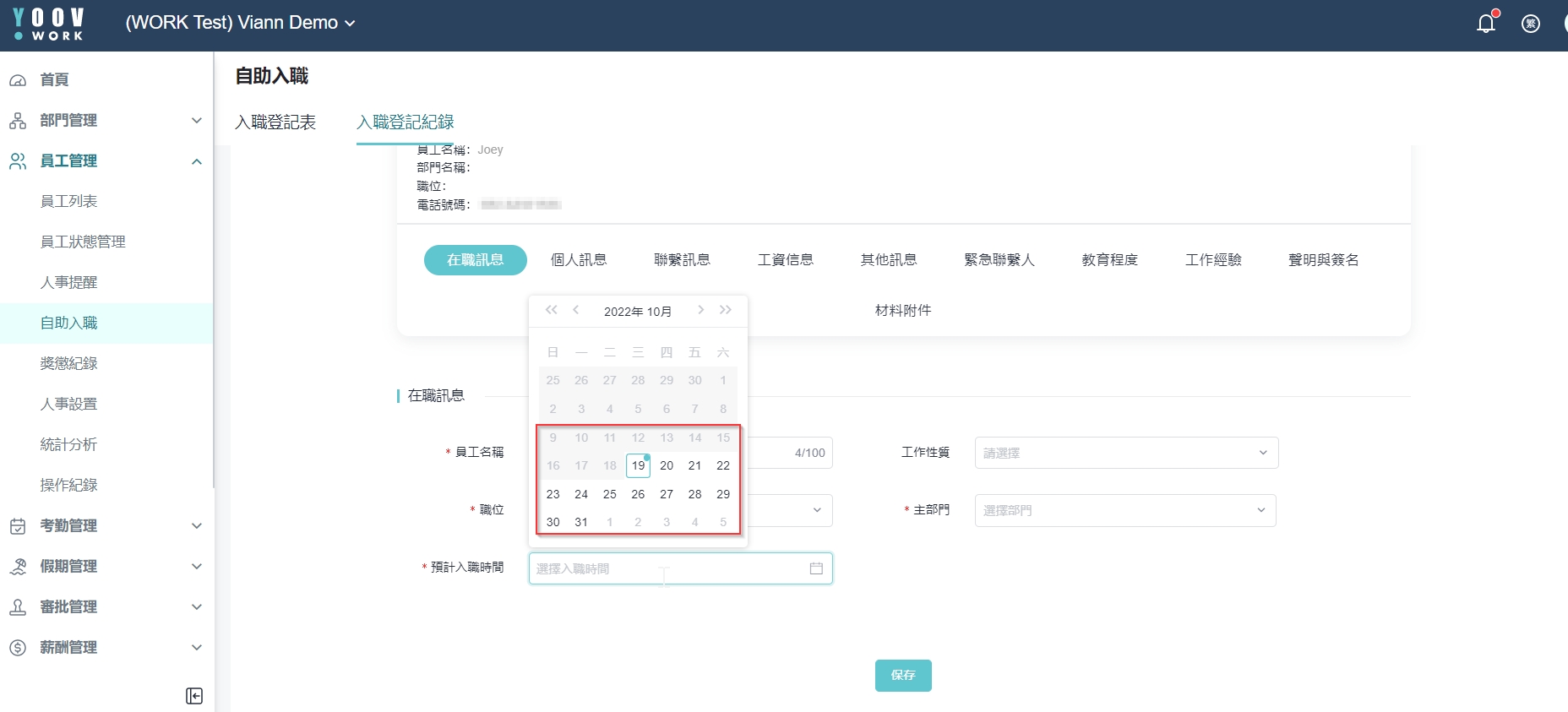 例子:今天是2022/10/19,员工Joey今天到公司签约和填写入职申请,将于2022/10/21首天上班。