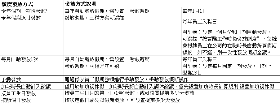 3.手动发放 1.依公历年(1月1日-12月31日),超过有效期限后,可自订余额保留期限 2.依该年度入职周年日起12个月,超过有效期限后,可自订余额保留期限 3.自发放日起1个月,超过有效期限后,可自订余额保留期限 4.永久有效