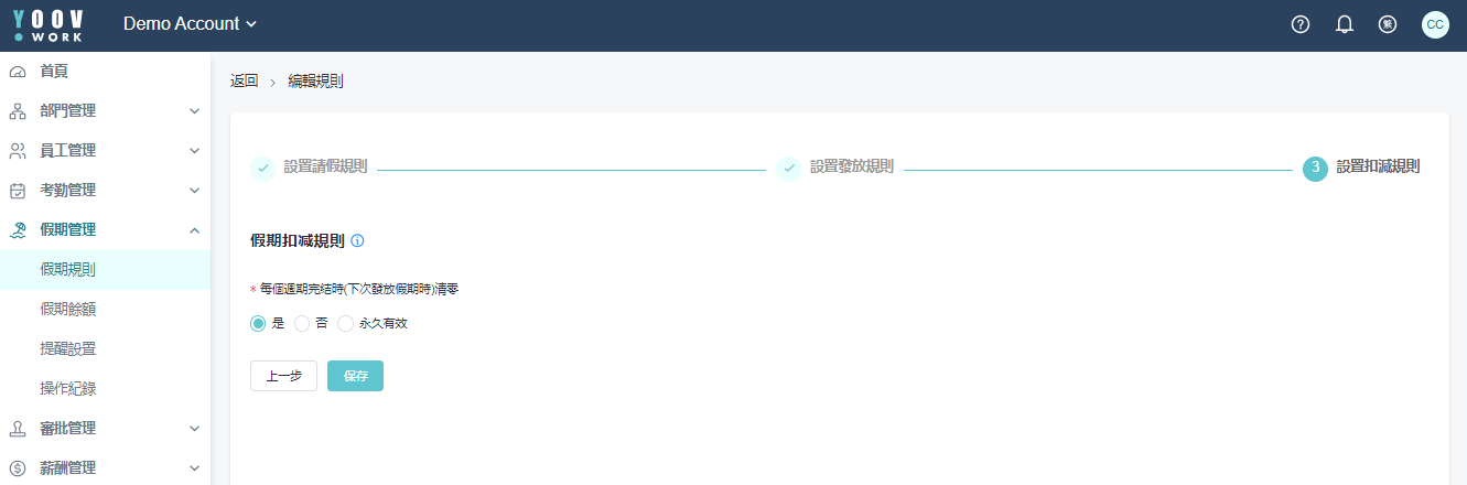如果公司是允许员工将假期储起,并带到下一个年度,可以在假期扣减规则的位置设置假期在周期完结时会否清零,及上一个周期余下的假期最多可延续多久。