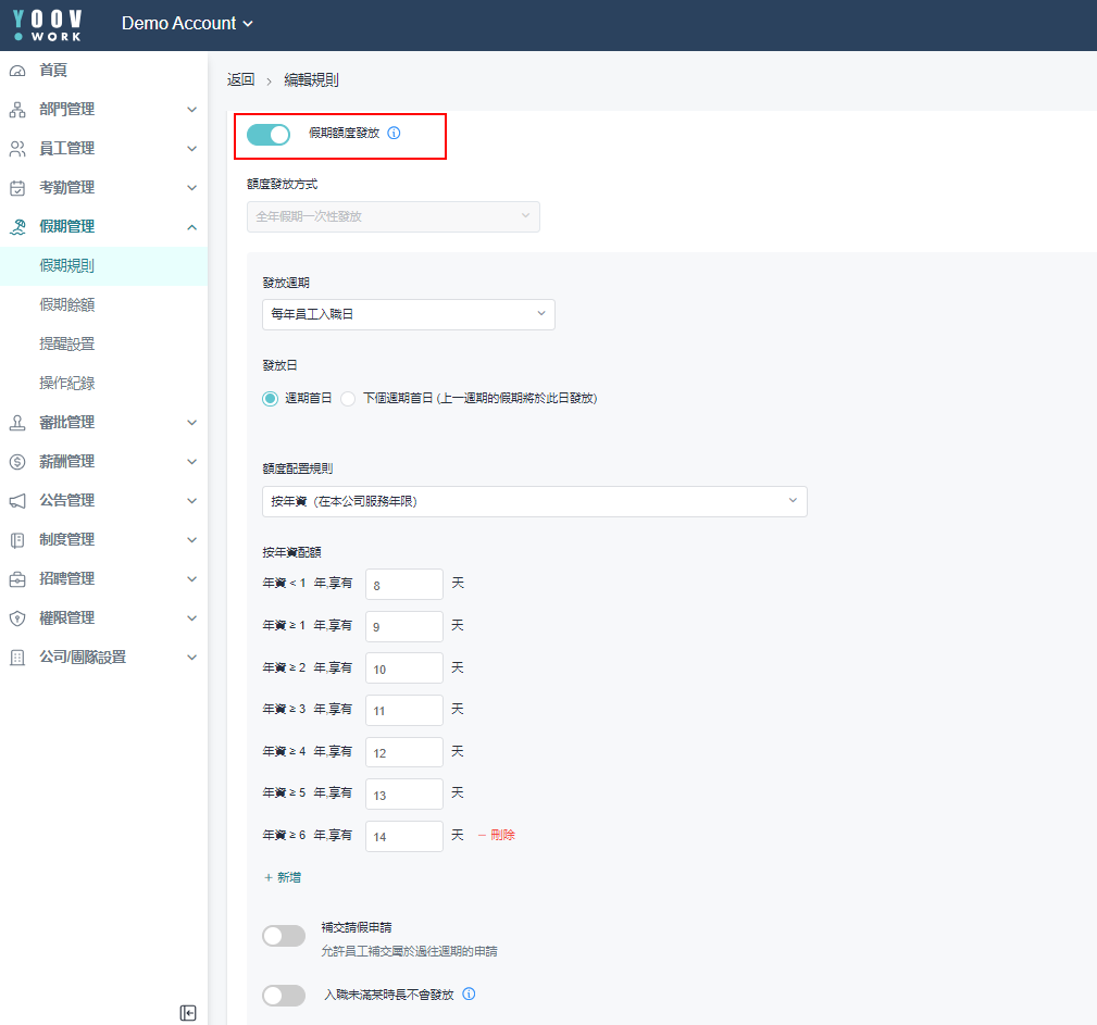 2. 假期 「设置发放规则」 设定: 若关闭假期额度发放,则假期额度无限制,员工申请即可享有;若有限制假期额度发放则开启此项。