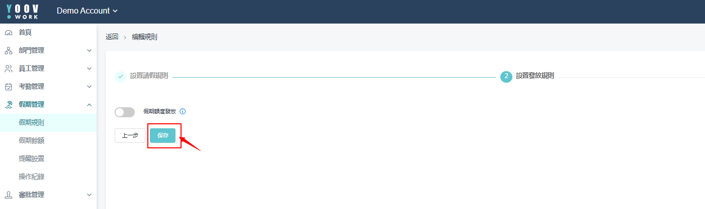 系统亦允许管理员自行设置假期有效的延续时间。详细说明可参考 「 2.3 扣减规则说明 」 ,设定完成后点击 「保存」。