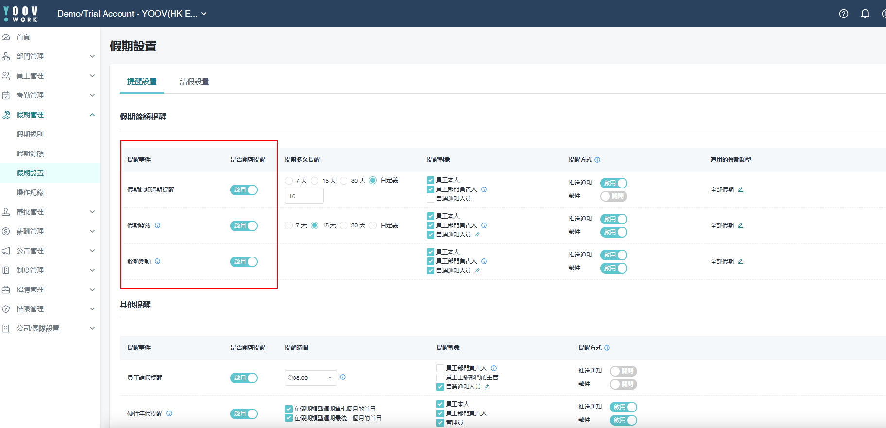 ［假期管理］>［提醒设定］> 「启用」 假期余额过期提醒