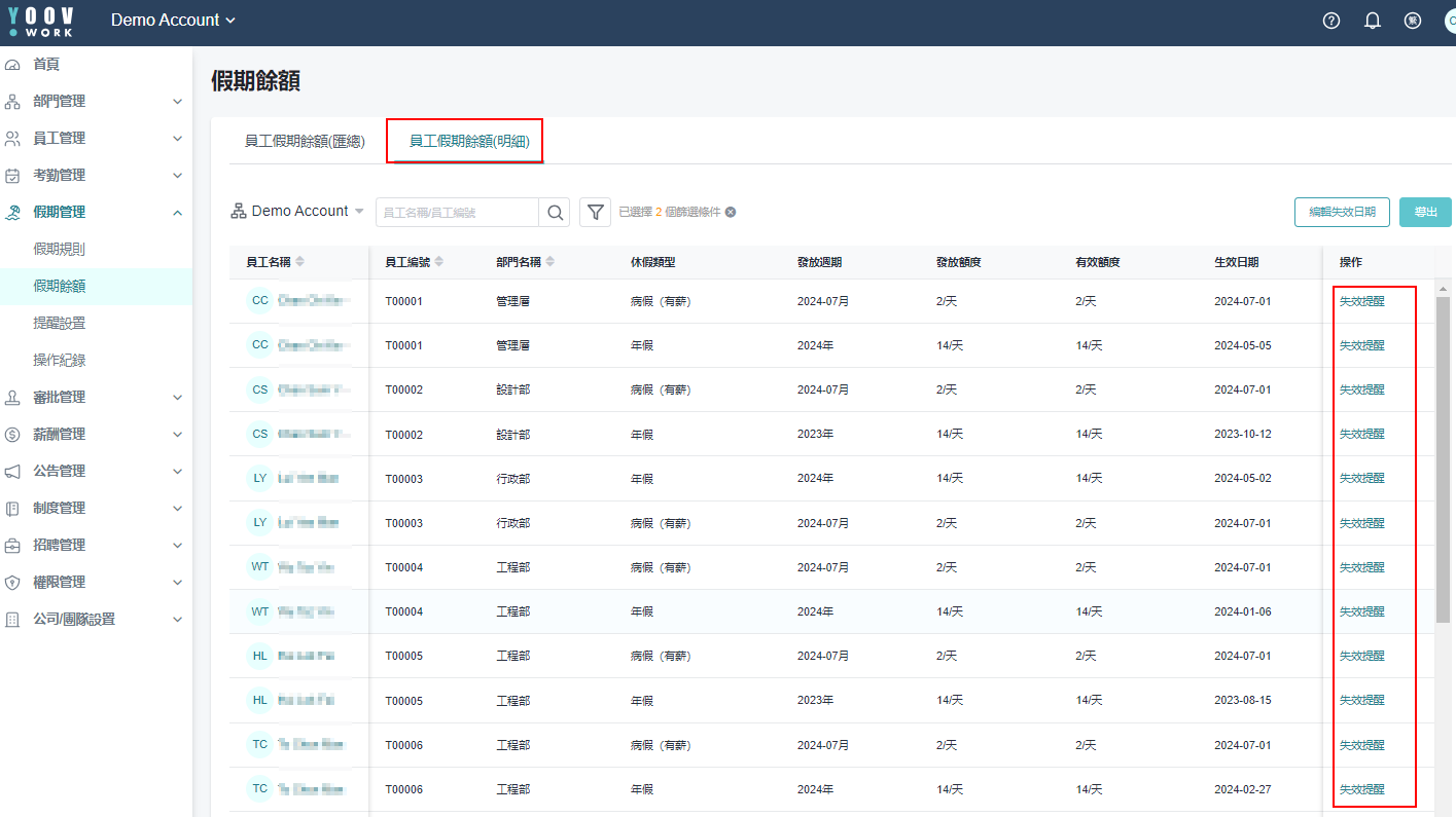 ［假期管理］>［假期余额］>［员工假期余额(明细)］> 点选 「失效提醒」