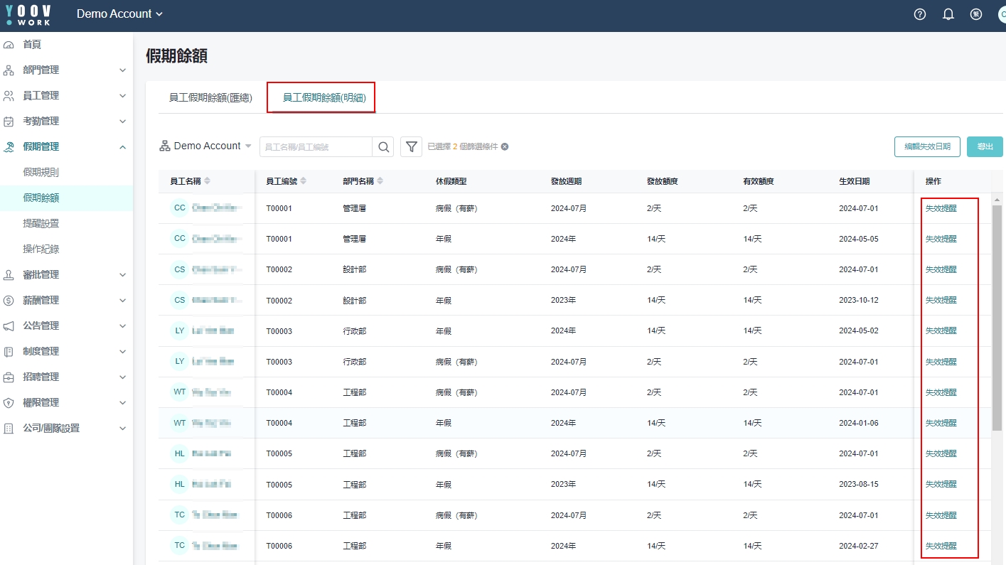 操作步骤: [假期管理]>[假期余额]>[员工假期余额(明细)]> 点选 「失效提醒」