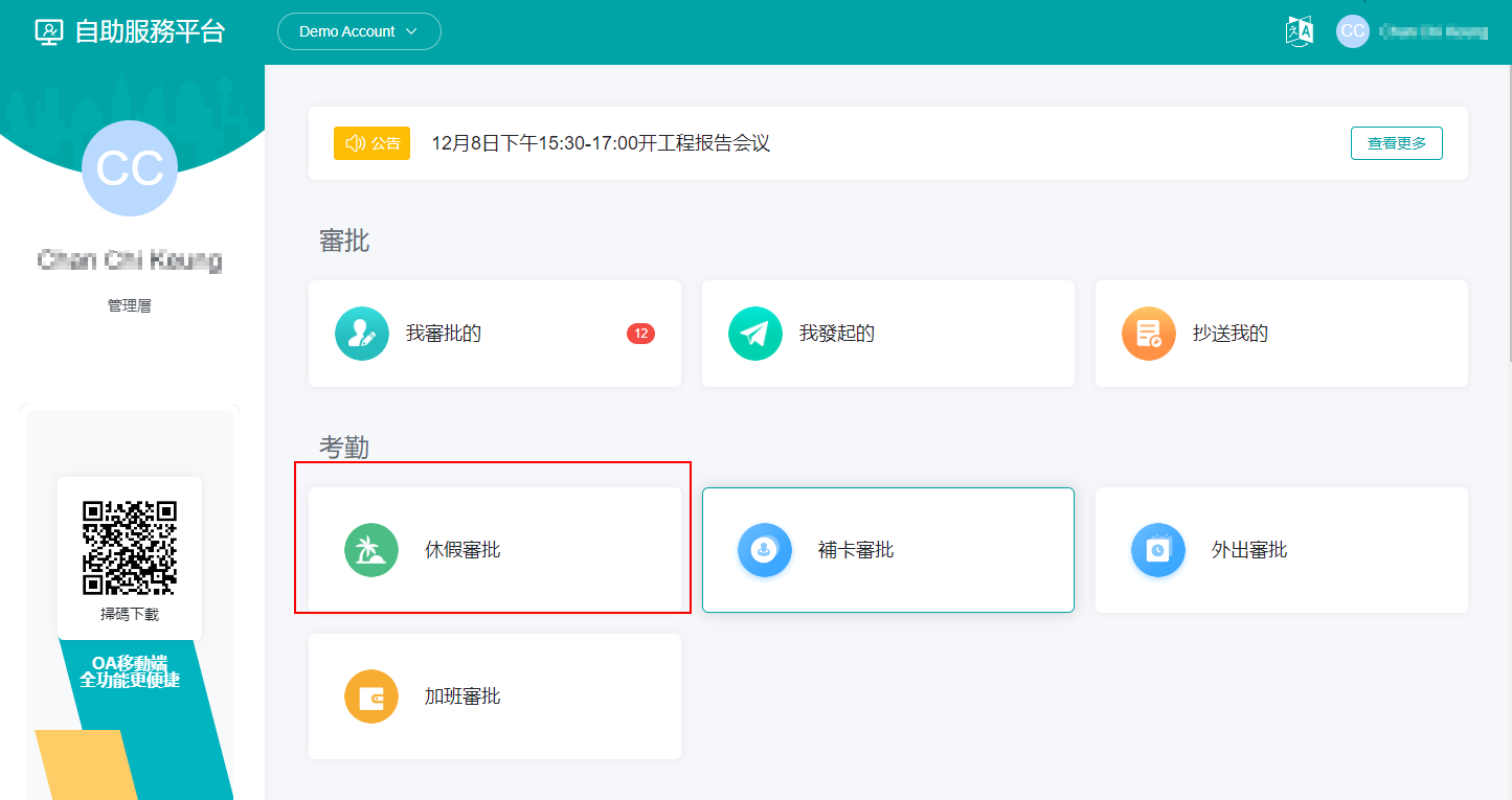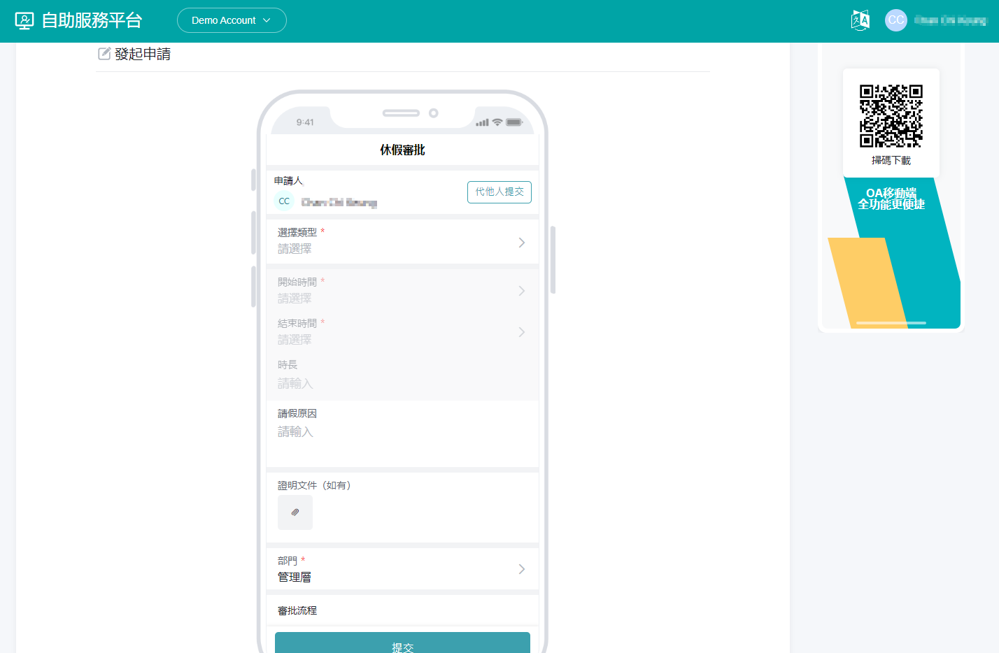 * 管理员为员工设定了相关适用假期后，员工可以在员工自助平台或在APP的批准模组上申请假期。