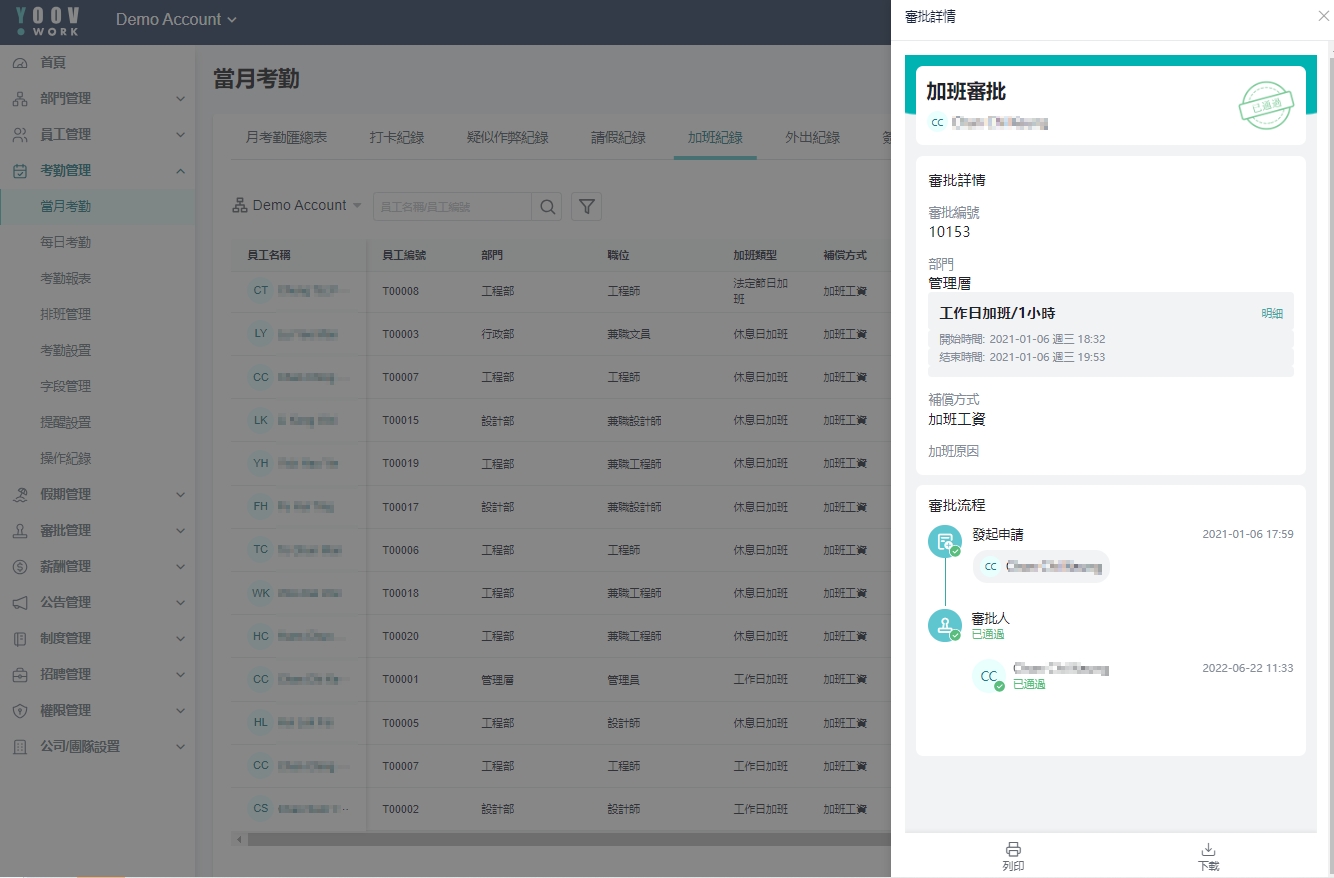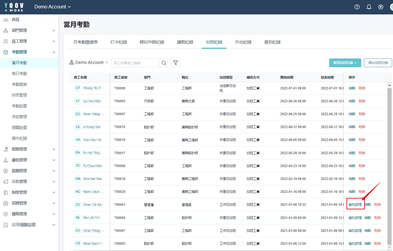 加班审批通过的记录,也将自动同步到加班记录中,可以在该页中查看到审批详情。