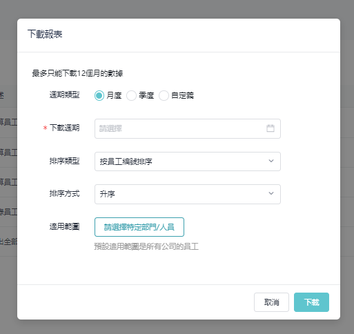 在下载报表窗口，选择相关选项，选择指定部门/人员，点选 「下载」