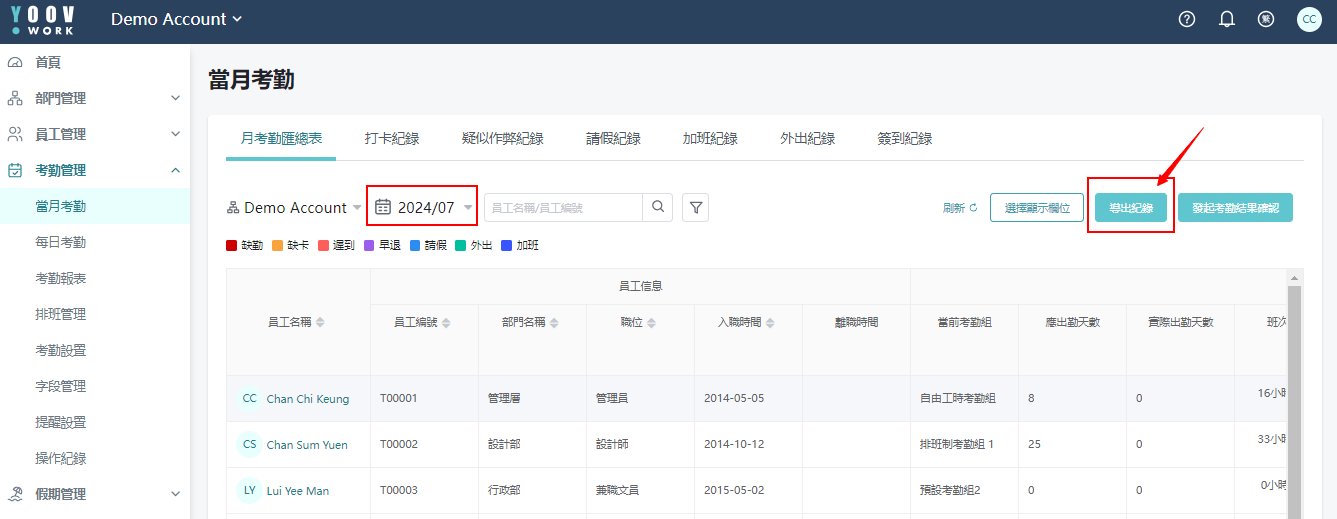 ［考勤管理］>［当月考勤］>［月考勤总表］> 选择时间 > 「导出记录」