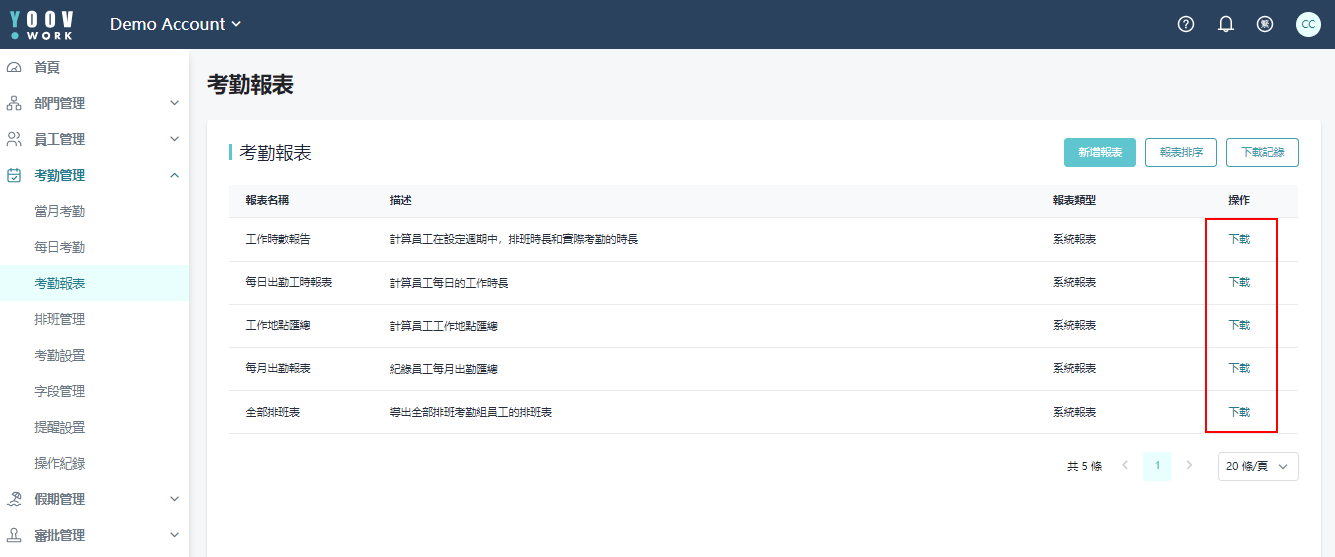 <table data-header-hidden><thead><tr><th width="226"></th><th></th></tr></thead><tbody><tr><td>报表名称</td><td>说明</td></tr><tr><td>工作时数报告</td><td>计算员工在设定周期中，排班时长和实际考勤的时长</td></tr><tr><td>每日出勤工时报表</td><td>计算员工每日的工作时长</td></tr><tr><td>工作地点总结</td><td>计算员工工作地点总结</td></tr><tr><td>每月出席报表</td><td>记录员工每月出席总结</td></tr><tr><td>全部排班表</td><td>汇出全部排班考勤组的排班表</td></tr></tbody></table>