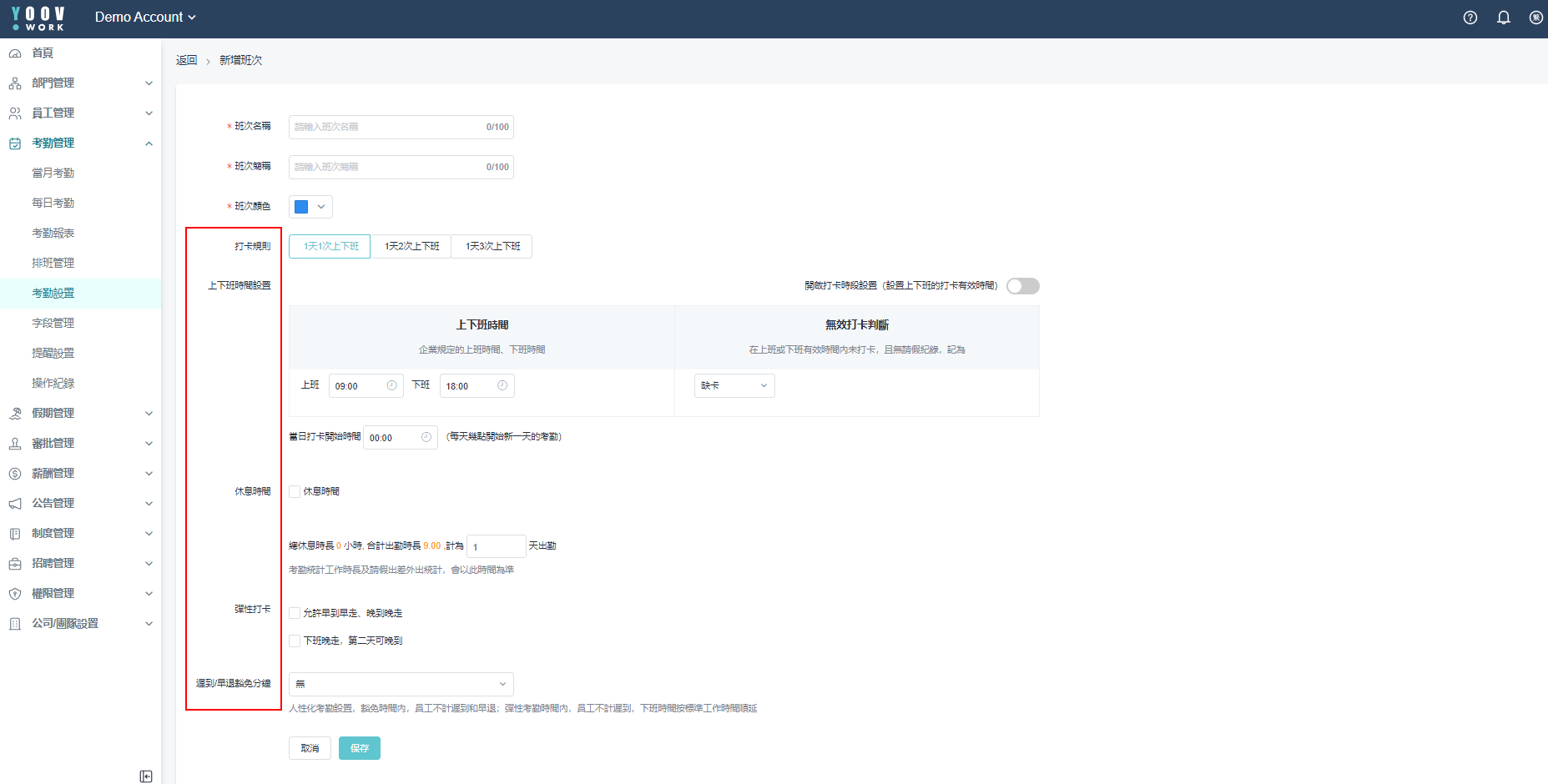 ③ 设定打卡规则、打卡有效时间、无效打卡判断、休息时间、班次出勤时长、弹性打卡规则、迟到/早退豁免时间，点击 「提交」 班次设定说明。