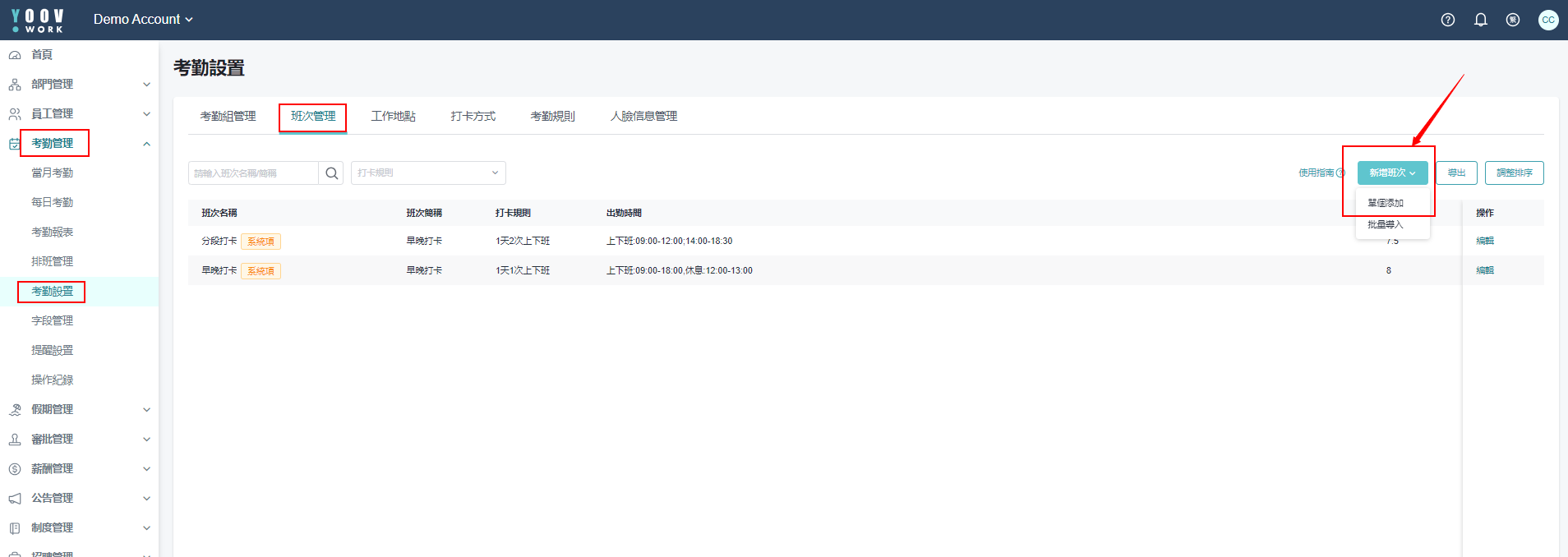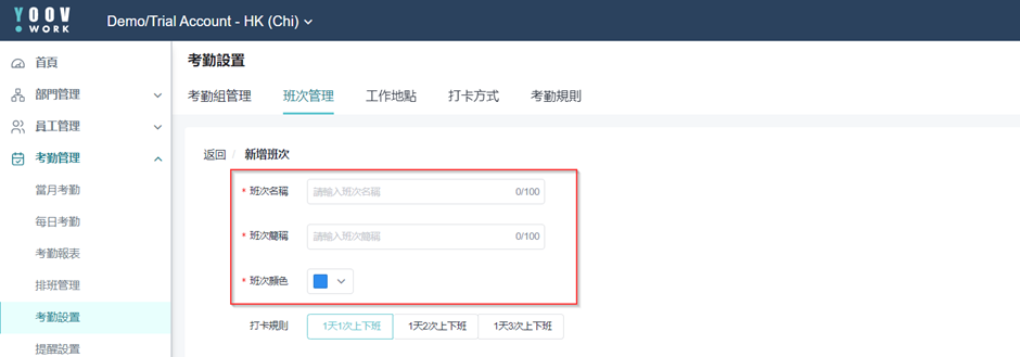 * 在设立考勤组之前，管理员需要设置公司所有会出现的班次。