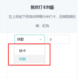 * 员工未在上班或下班有效时间内打卡，且无请假等记录，系统则会判断为无效打卡，并依设定记为 「缺卡」 或 「缺勤」。