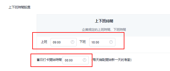 * 设定公司规定的上下班时间和当日打卡开始时间。
