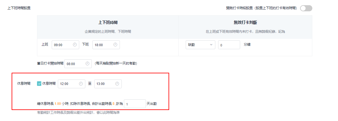 * 如需再仔细一点，可开启 「打卡时段设置」 ，设定员工上下班的打卡有效时间。