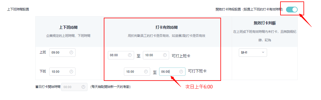 请注意： 若公司允许员工在隔天凌晨下班，则需设定打卡有效时间范围至隔天，以避免出现今天下班卡记录出现为隔天的上班卡状况。如上图所示。