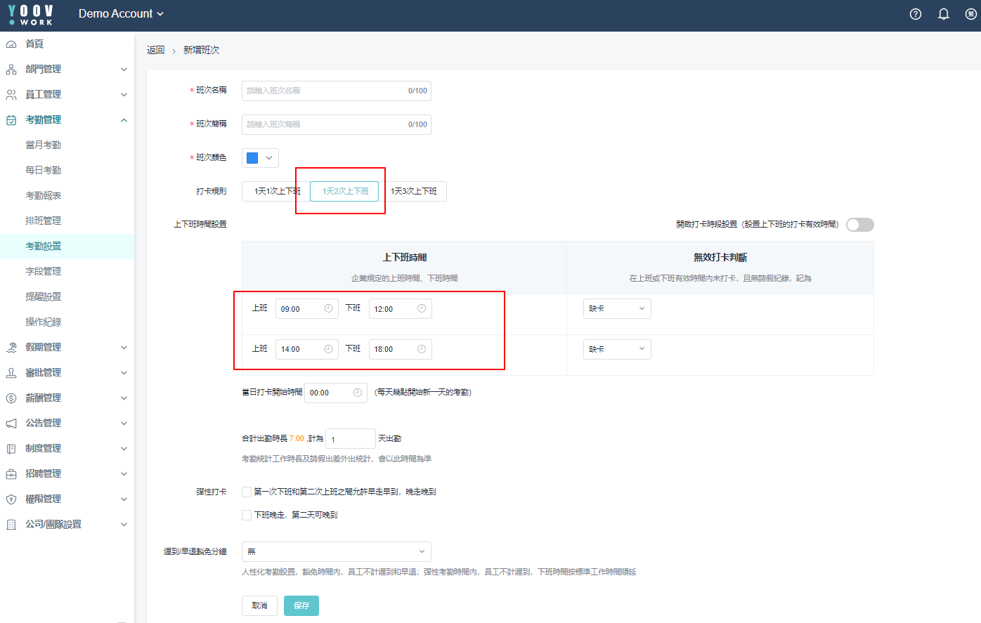 * 例如：公司要求员工午餐时间需要打卡，则可以设定1天2次上下班，那一天将有4次打卡纪录。即早上上班一次(09:00)、中午午餐时间一次(12:00)、下午上班一次(14:00)、下午下班一次(18:00)