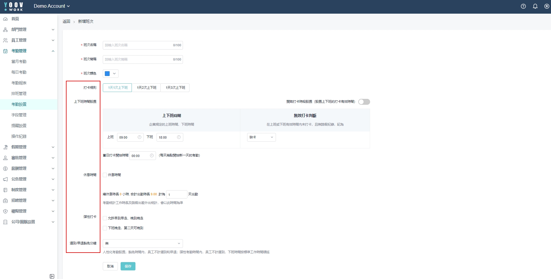 操作步骤: 1.[考勤管理]>[考勤设置]>[班次管理]>[新增班次] 2. 填写班次名称、班次简称,选择班次颜色。颜色将会显示于员工排班表上,便于识别不同的班次,所以在建立时请尽量避免选用类近颜色。 3. 设定打卡规则、打卡有效时间、无效打卡判断、休息时间、班次出勤时长、弹性打卡规则、迟到/早退豁免时间,点击 「提交」 班次设定说明。
