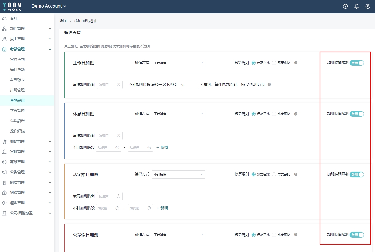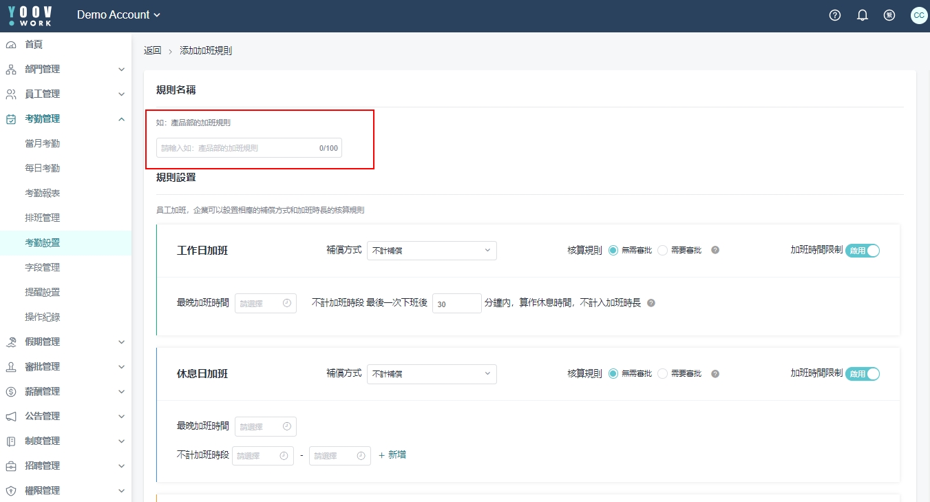 管理员可以对工作日、休息日和法定假日分别设定加班规则,系统将根据设定核算出最终的加班时长。