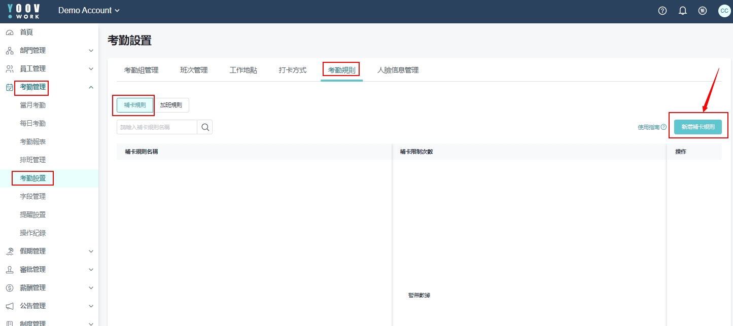 操作步骤: [考勤管理]>[考勤设置]>[考勤规则]>[补卡规则]>[新增补卡规则]