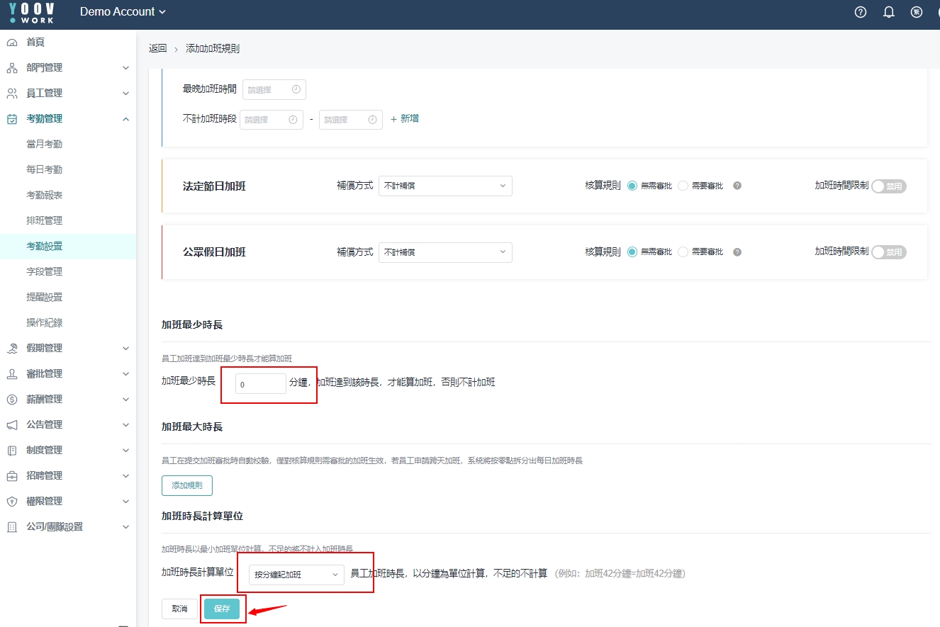 操作步骤: ①[考勤管理]>[考勤设置]>[考勤规则]>[加班规则]>[新增加班规则] ② 在新增加班规则页面,填写加班规则名称,设置工作日、休息日、法定假日的加班补偿方式、会计规则、加班时间限制和加班规则设置说明。 ③ 设定加班最少时长、加班时长计算单位,点选 「保存」 。