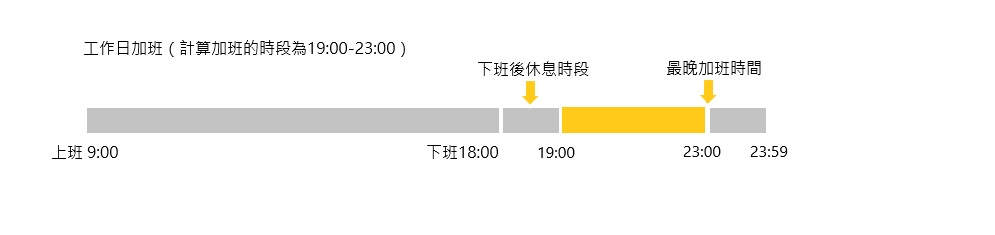 ① 工作日加班时间限制 支援设定最晚加班时间、不计加班时段(最后一次下班的休息时间)。 例如:平日班次上下班时间为09:00-18:00;设定下午下班后的休息时间为60分钟;最晚加班时长为23:00。