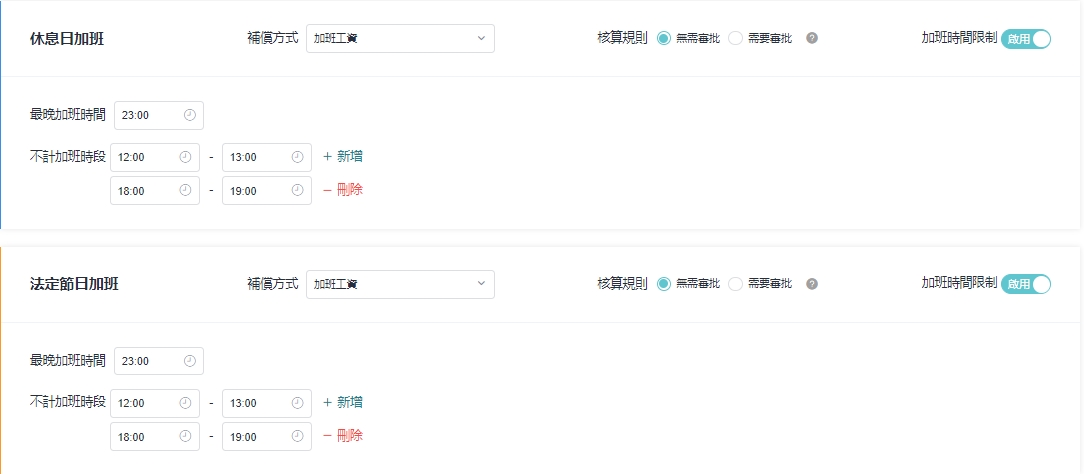 ② 休息日/法定假日加班时间限制 支援设定最晚加班时间、不计加班时段。 例如:员工加班打卡有效时段为00:00-23:59;设定不计加班时段为12:00-13:00和18:00-19:00,最晚加班时间为23:00。
