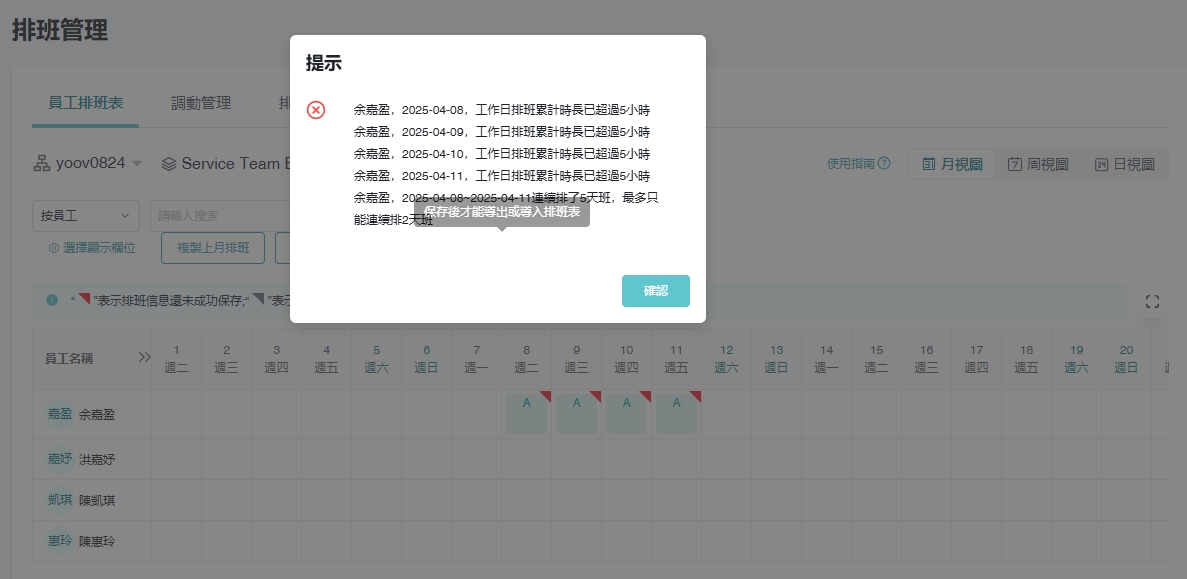 * 如排班超过累计时数，系统会向管理员发出警告通知。