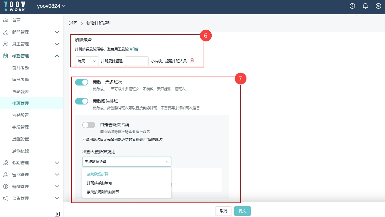 ⑤  可新增**排班时长风险预警**，以提醒和避免合规风险。\