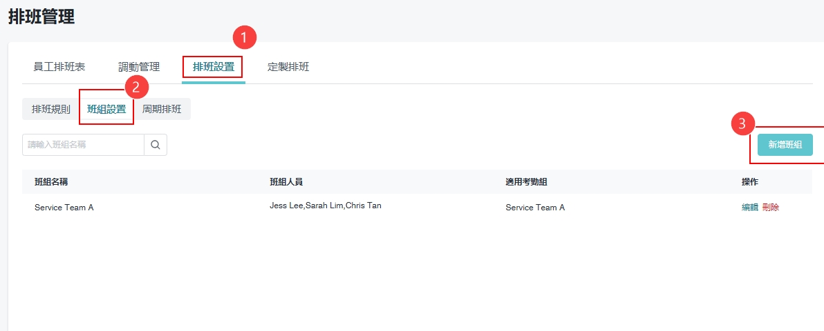 ①［考勤管理］>［排班管理］>［排班设置］> ［班组设置］> 再按［新增班组］\