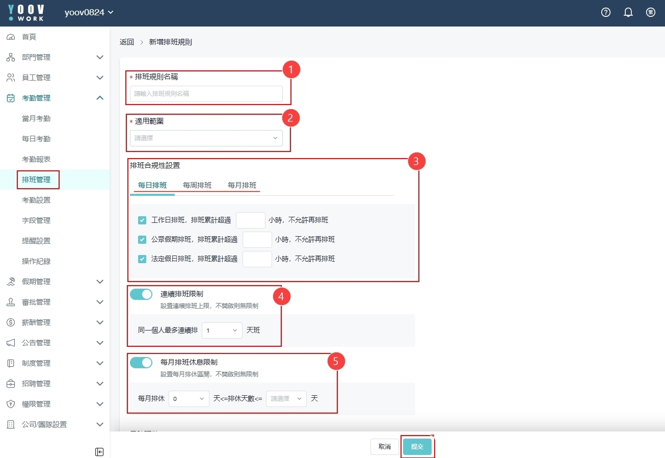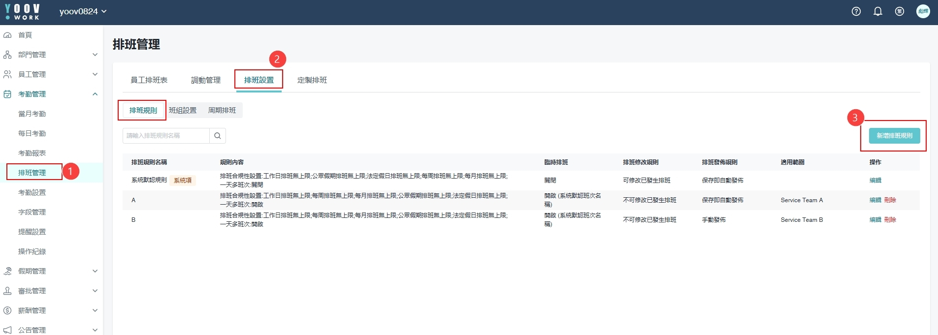 ①［考勤管理］>［排班管理］>［排班设置］> ［排班规则］> 再［新增排班规则］/ 编辑 排班规则