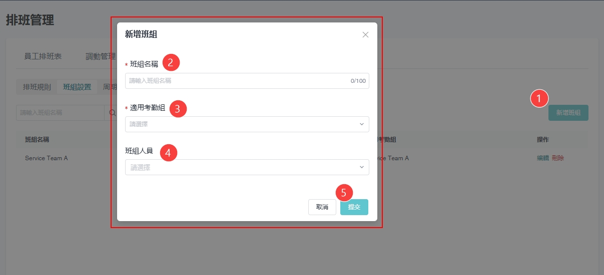 ② 输入所需资料如班组名称，适用考勤组等，按 \[提交] 以保存