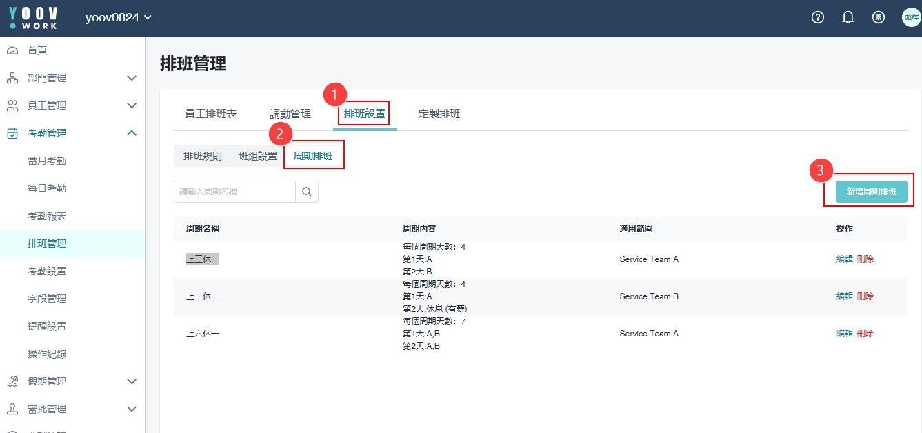 ①［考勤管理］>［排班管理］>［排班设置］> ［周期排班］> 再按［新增周期排班］\