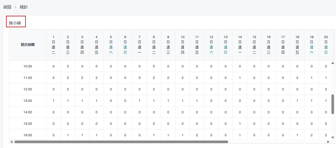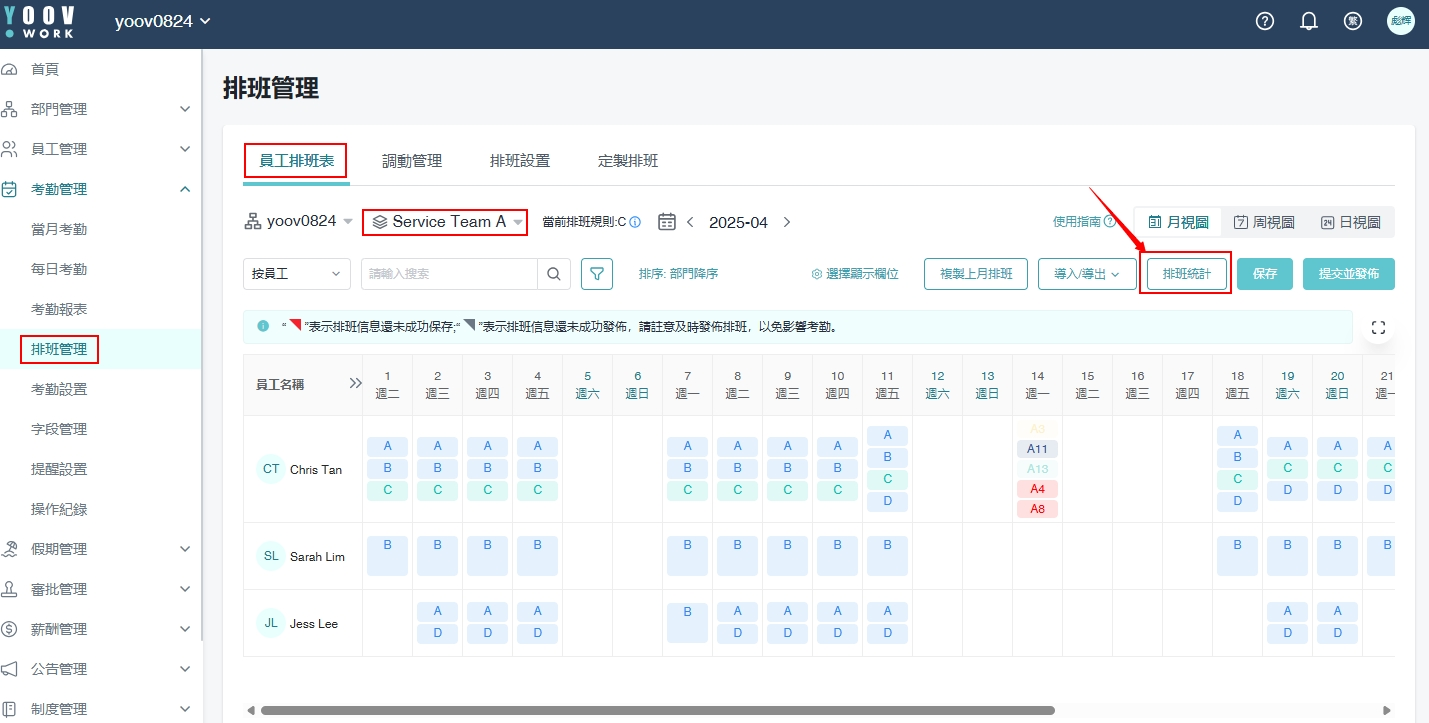 ［考勤管理］>［排班管理］>［员工排班表］>［选择考勤组］>［排班统计］