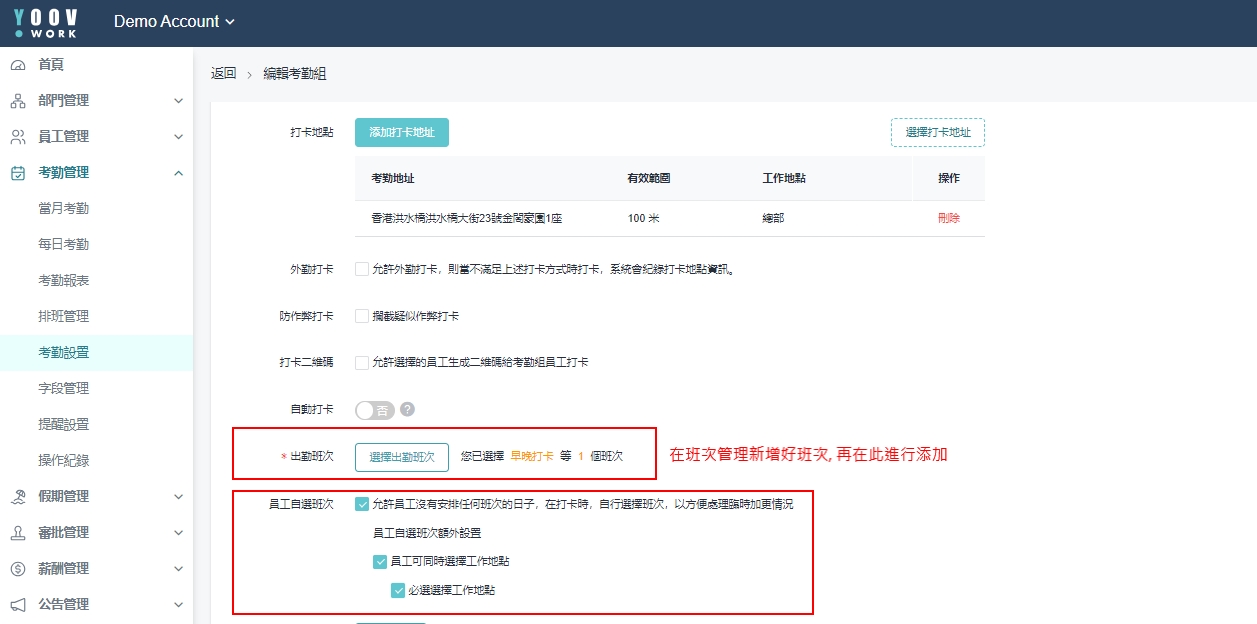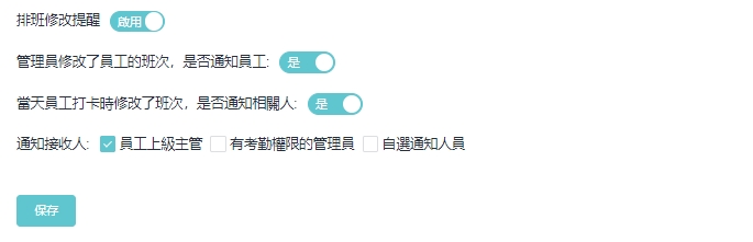 在[考勤管理]>[提醒设定]中,管理员可以启用打卡提醒、缺卡提醒、排班修改提醒的设置,设定后,员工会在APP上收到系统提醒讯息。