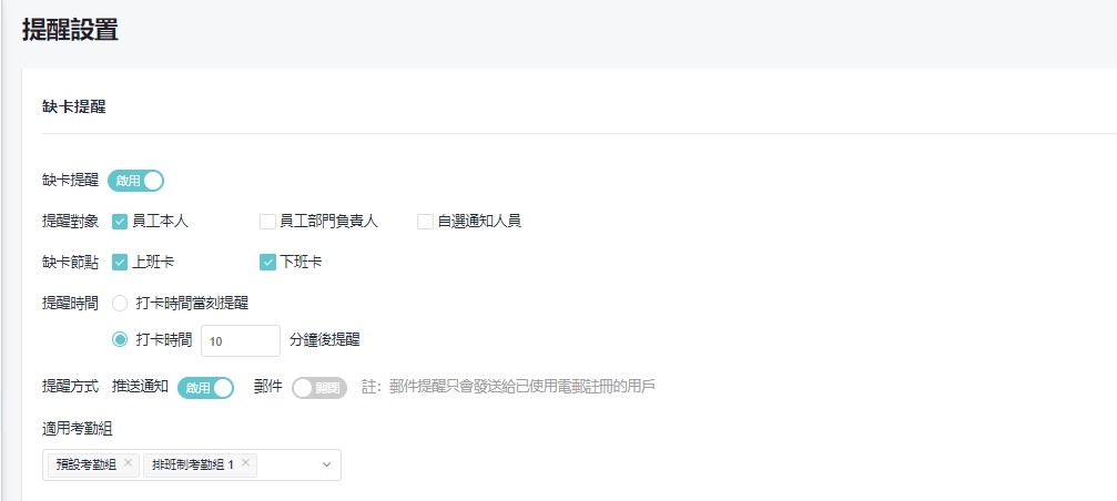 开启缺卡提醒后,管理员可设定提醒物件、缺卡节点(上班卡或下班卡)、提醒时间、提醒方式(邮件或推播通知),以及适用考勤群组。