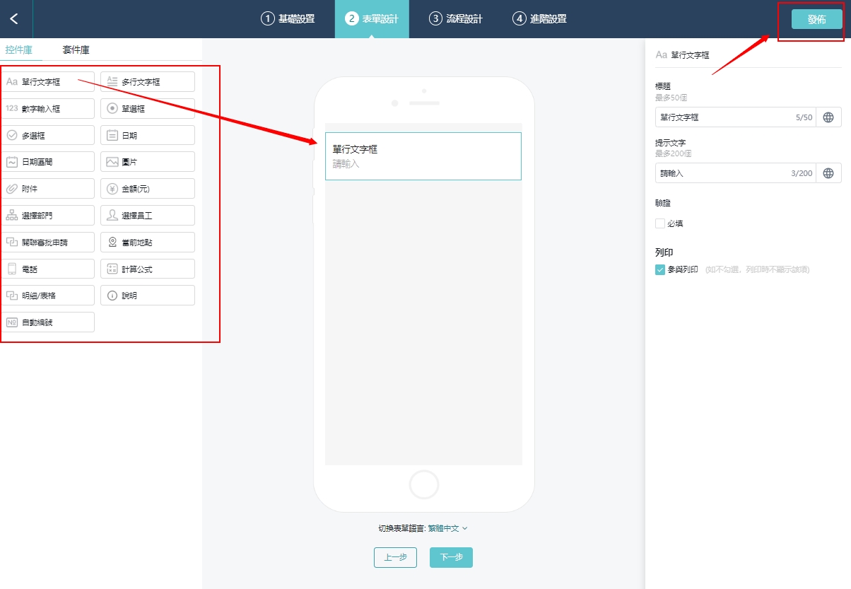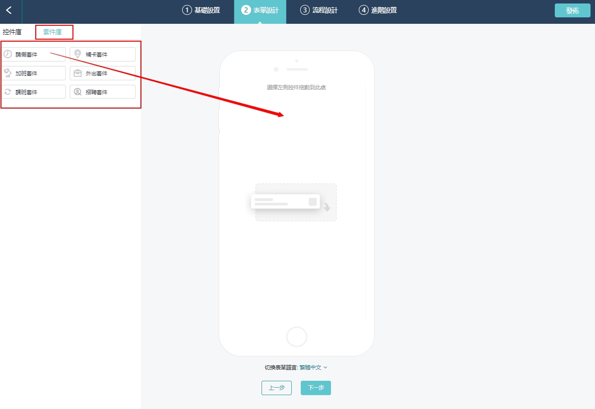若需自定表单,进入设置页面后,系统提供多个控制与套件,方便管理员根据公司管理需求配置出适当的表单。