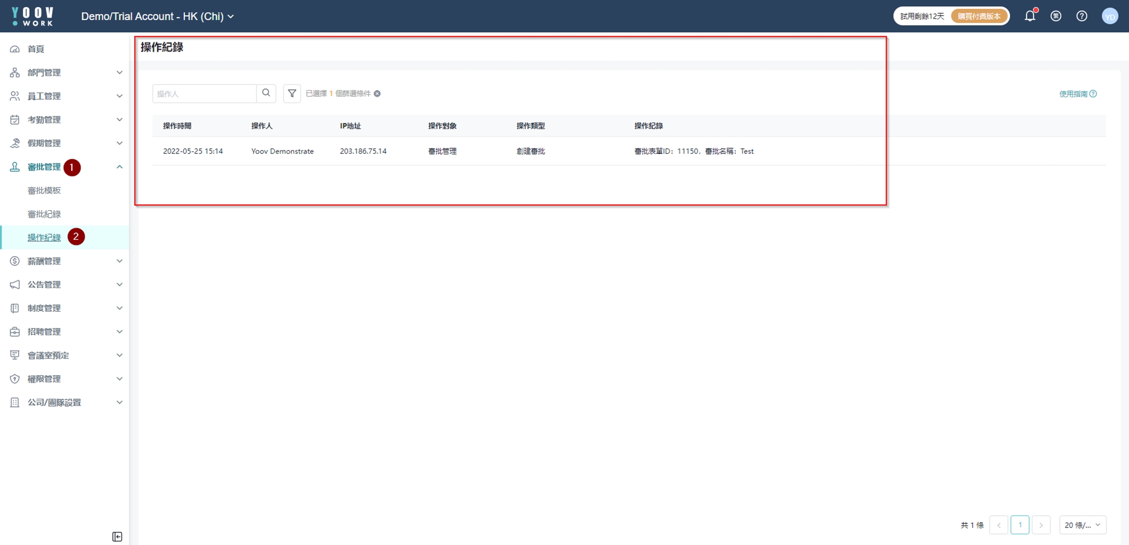基于系统可以让多于一名管理员操作,管理员可以在操作纪录中寻找所有管理员的改 动纪录。 详细检示操作时间、管理员名称、IP 地址、操作对象、类型以及具体操作,方便查询。 [审批管理]→[操作记录]